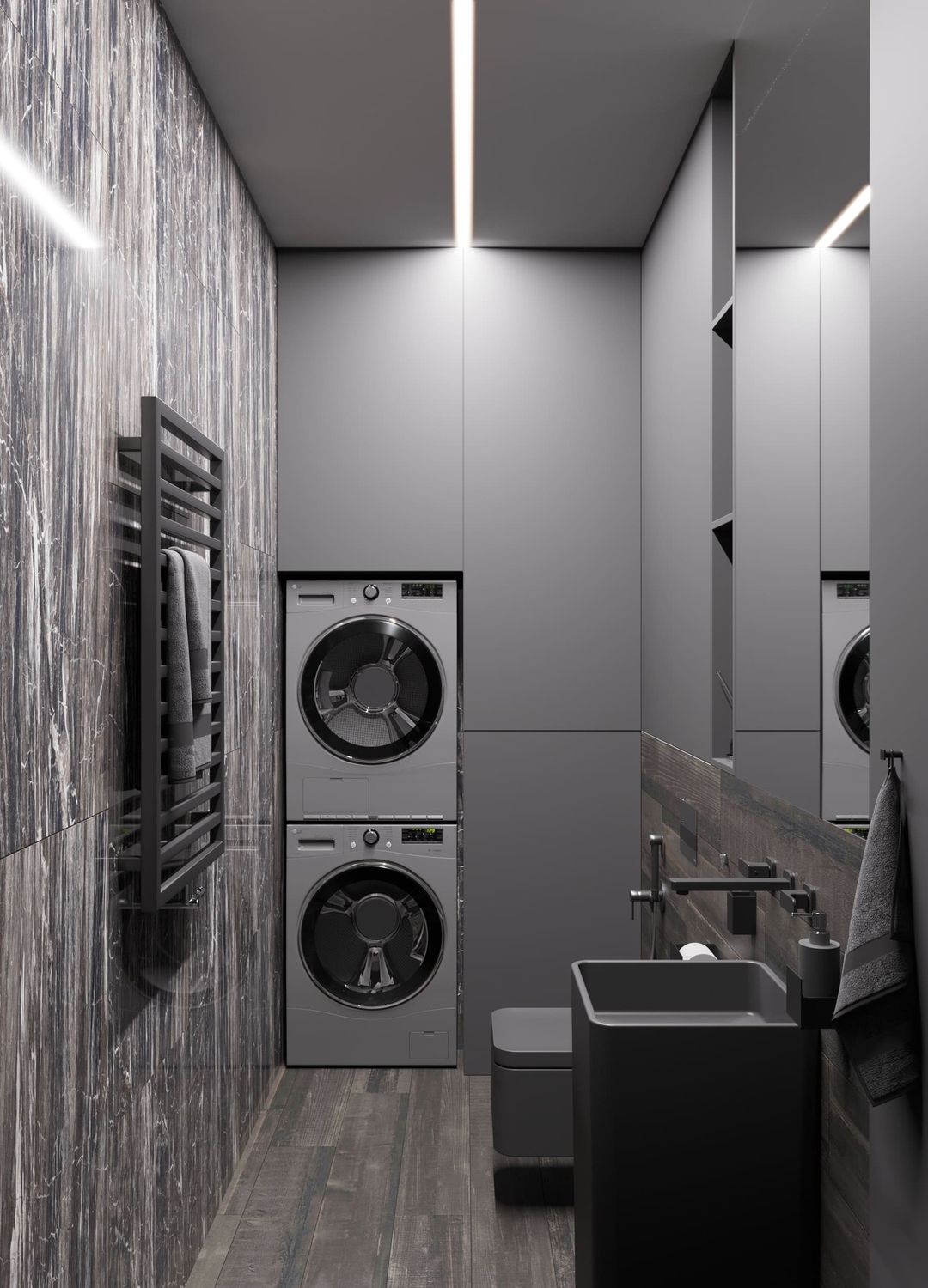 В кухне-гостиной три зоны: гостиная, столовая и кухня с консольной барной стойкой. Интерьер построен на сочетании большого количества текстур природных материалов: дерева и камня. А потолки спроектированы таким образом, что квартира как бы раскрывается при движении от входной двери в кухню-гостиную, так как высота помещения увеличивается до максимально возможной. Гостевой санузел выполняет также роль постирочной. Для этого в его глубине предусмотрены внушительные объемы для хранения и бытовой техники.