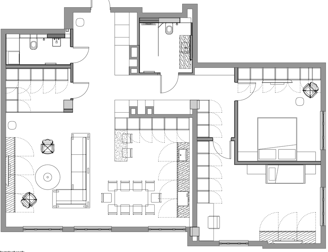 Квартира планировочно состоит из двух зон: «общественной» и приватной. К общественной, в которую попадаем при входе в квартиру, относятся прихожая, гостевой санузел, прозрачная стеклянная гардеробная и просторная кухня-гостиная.