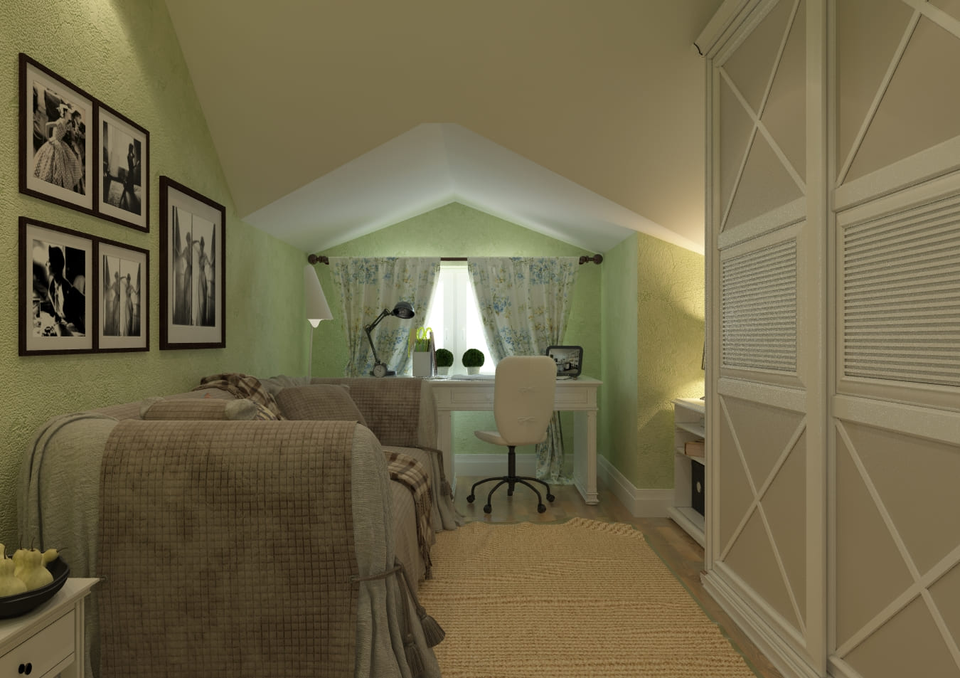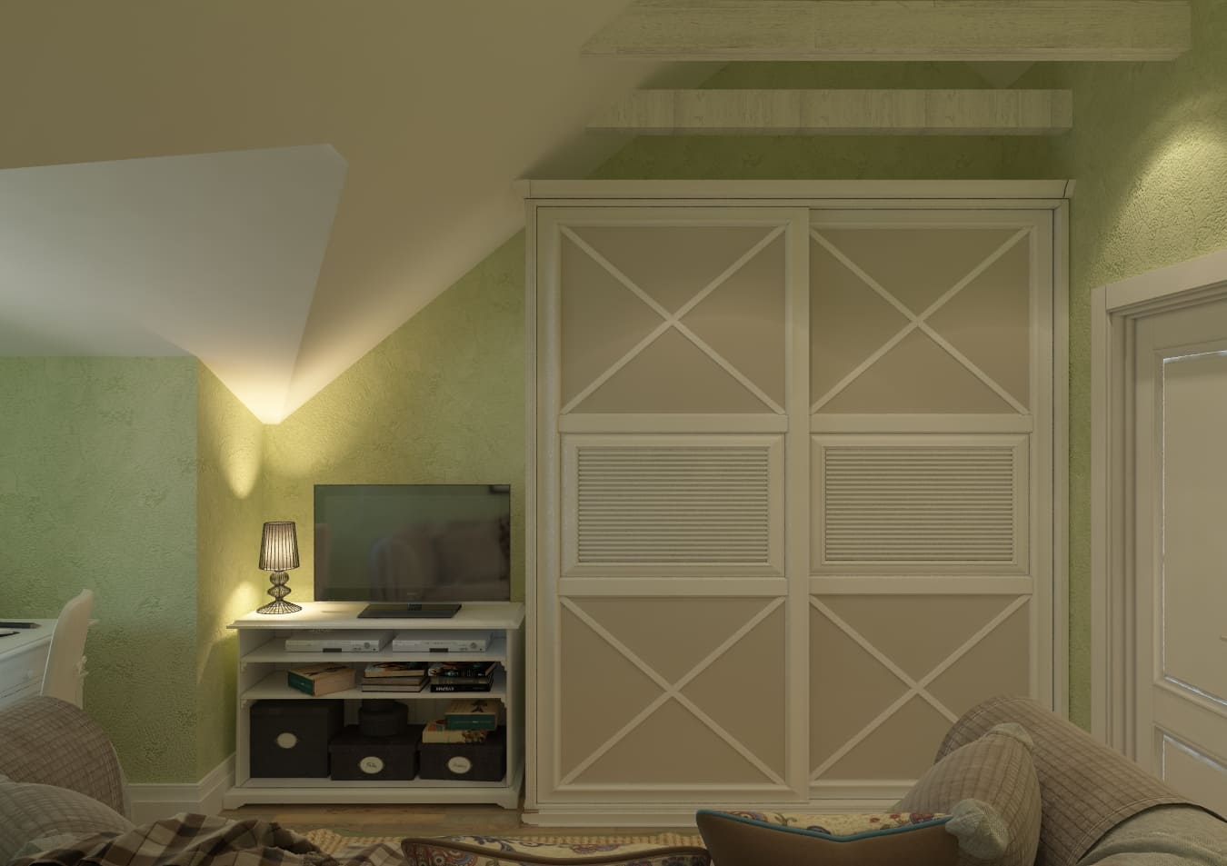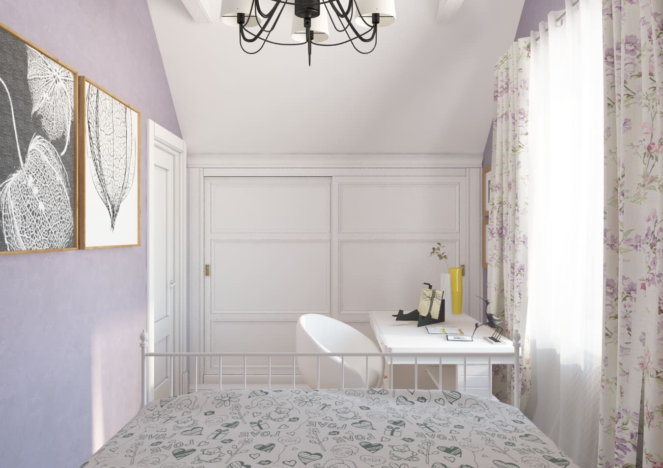 Жилые комнаты второго этажа небольшие, сам этаж мансардный, но мы везде предусмотрели места хранения, а в кабинете и комнате сына – место для работы или учебы. Во всех помещениях мы не стали подшивать существующие балки, а использовали их в качестве декоративных элементов, покрасив в детской в белый цвет.