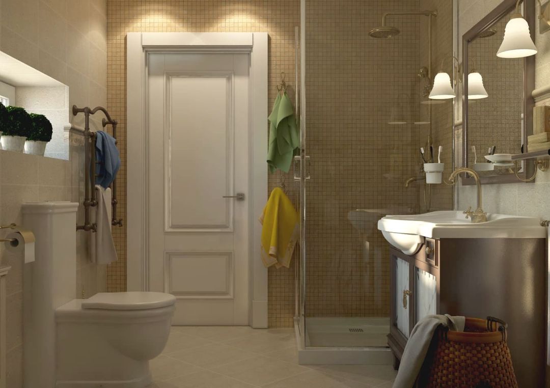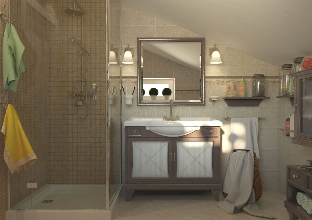 Ванная второго этажа совсем небольшая, скатная кровля затрудняет размещение сантехники и мебели. Тем не менее, здесь мы разместили душевую, раковину с зеркалом и места хранения.