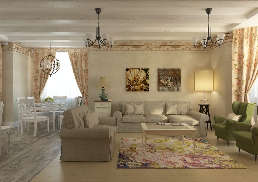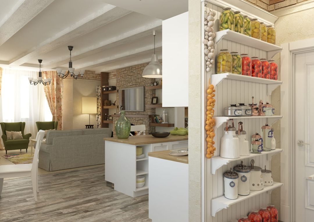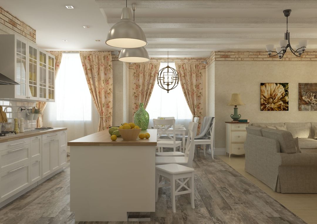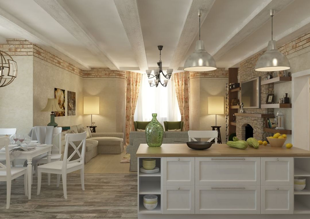 Кухня-гостиная разделена на две части не только функционально (расположением мебели), но и разными материалами пола. Под потолком размещены декоративные балки, которые структурируют пространство,улучшают его пропорции, делая визуально выше.