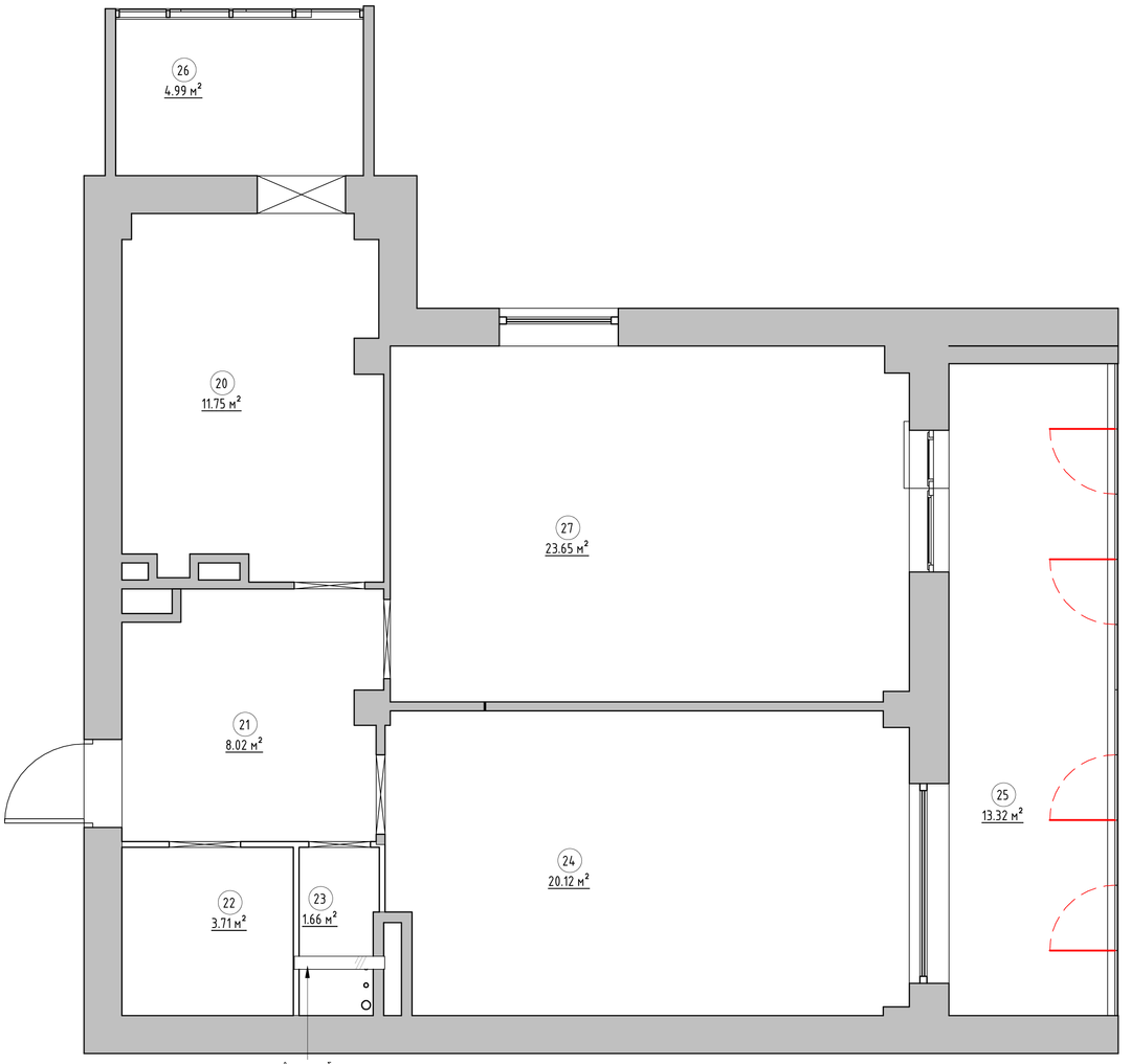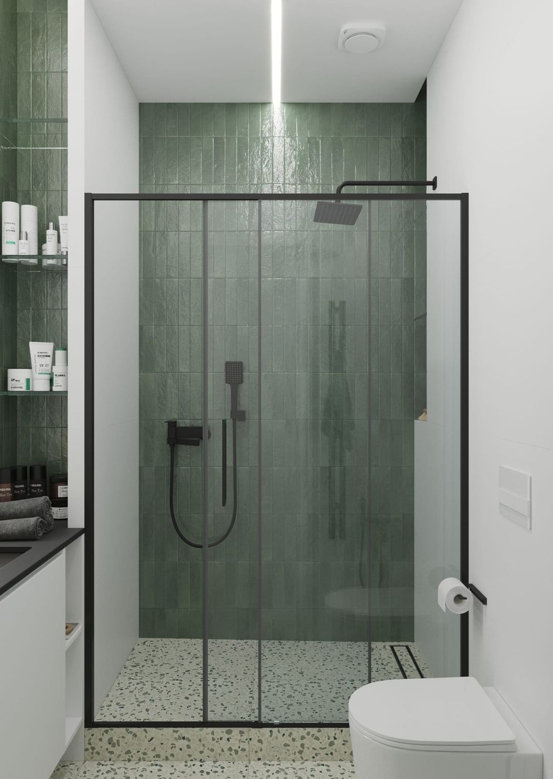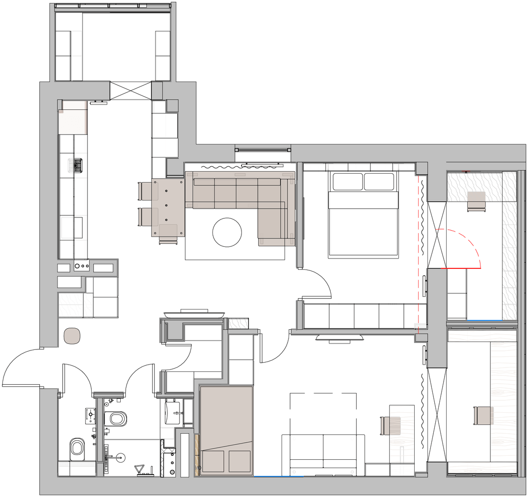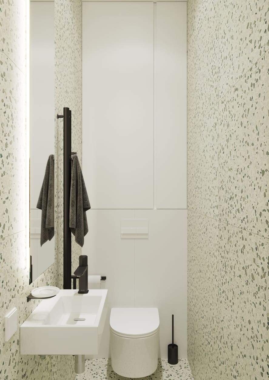 В результате работы над планировкой нам удалось создать ещё одну жилую комнату, сохранив площадь для гостиной. Балкон мы разделили на две части: одна, при спальне, стала кабинетом, другая — художественной мастерской для дочери. В проекте необходимо было предусмотреть два унитаза. Для выполнения этого условия нам пришлось изменить, поменяв санузлы местами.