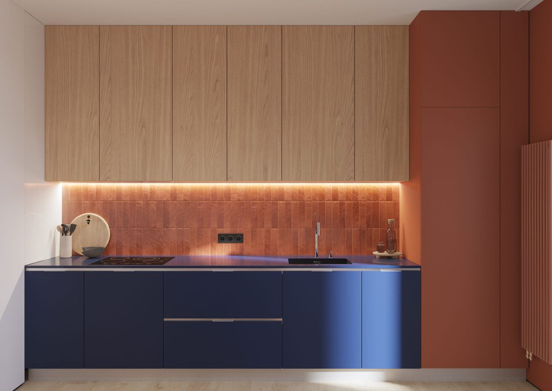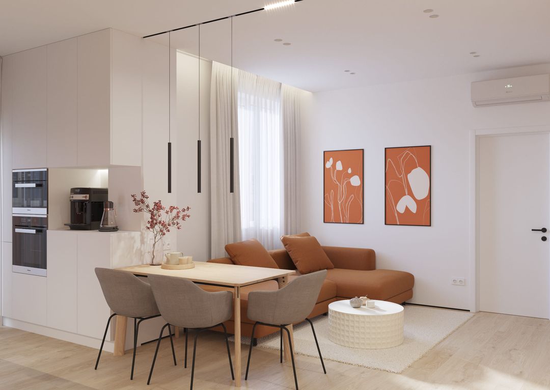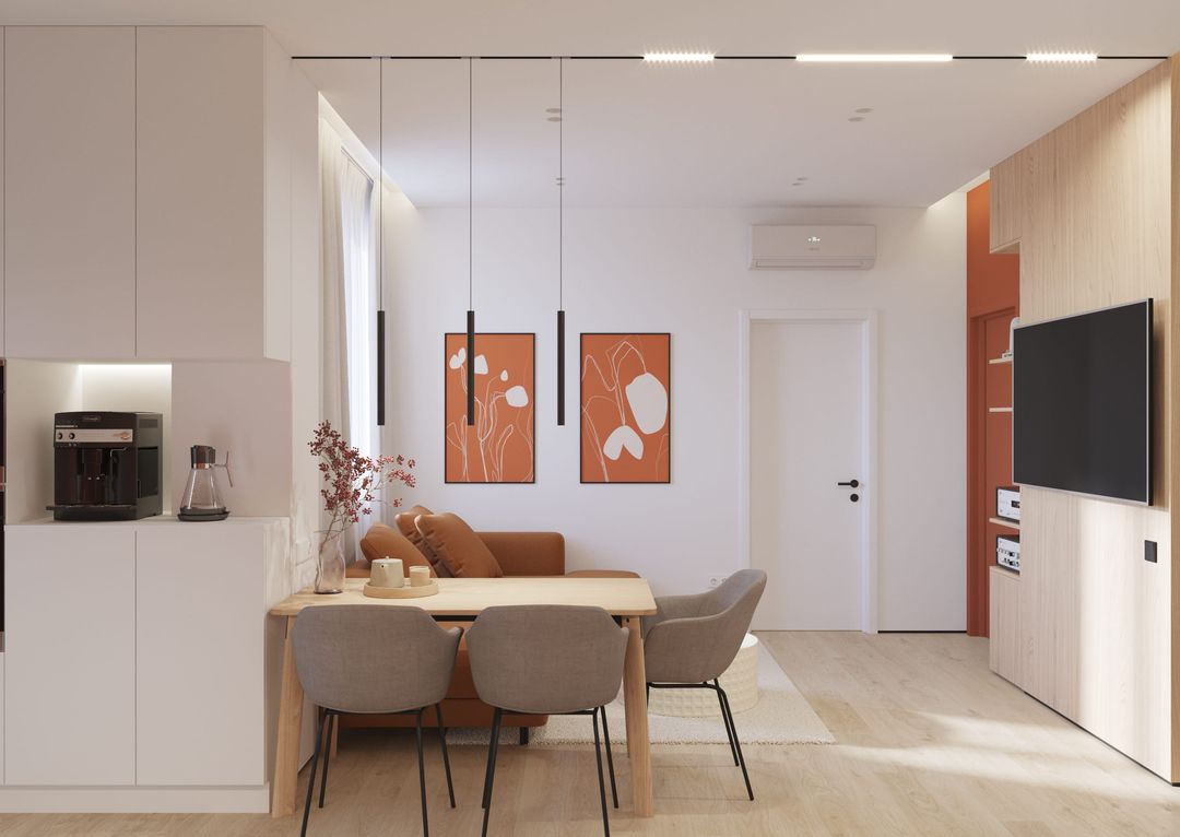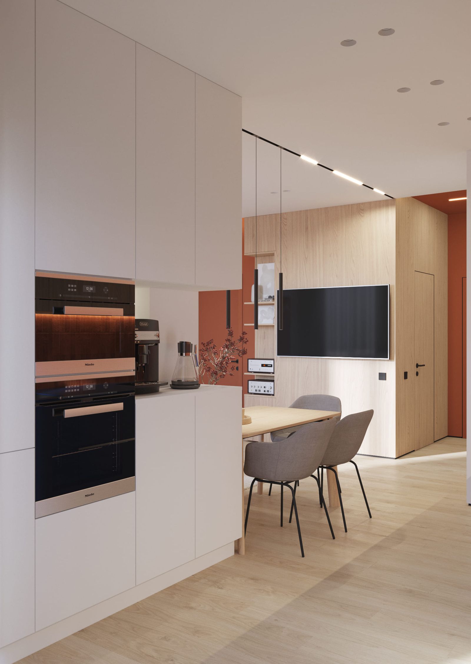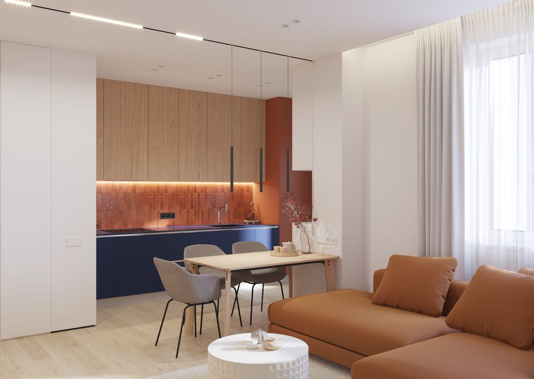 После объединения жилой комнаты и кухни мы получили большое пространство сложной конфигурации. Для того, чтобы не делать пространство слишком дробным, мы в качестве фона использовали белый цвет, добавив к нему яркие акценты: терракотовая плитка фартука кухни, синий низ кухни, диван, картины на стене спальни. Как мы уже писали выше, дом каркасно-монолитный, это повлияло, в том числе, на конфигурацию пеналов кухни. Помимо крупной бытовой техники мы спроектировали там нишу для кофемашины.