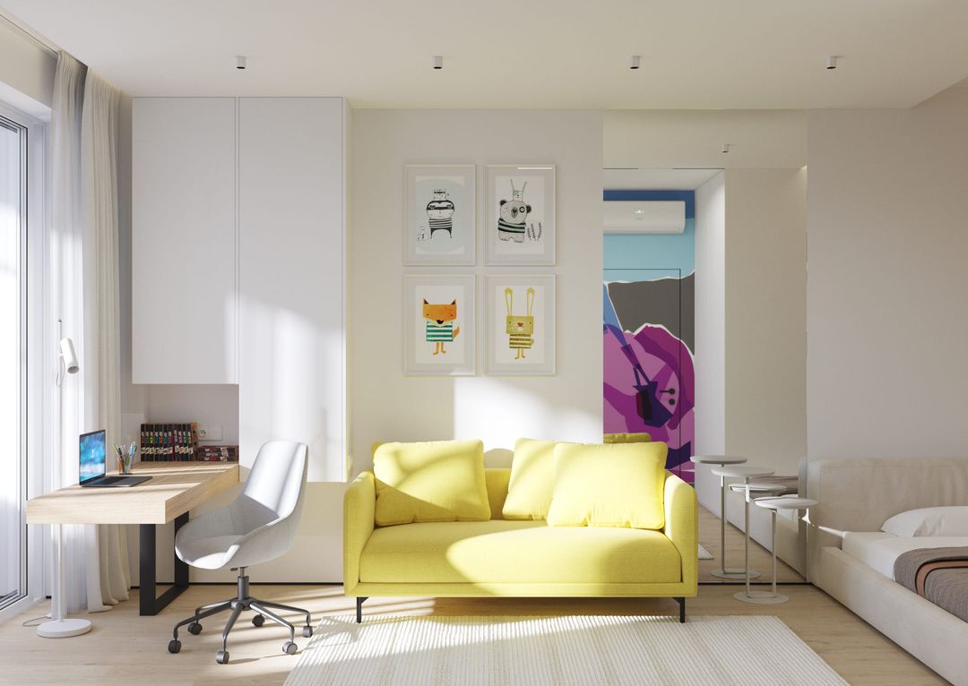 В небольшой детской нам нужно было расположить кровать, раскладной диван с телевизором, зону учебы и места хранения. Чтобы кровать не занимала много места мы разместили её в нише, образованной уступом стены и шкафами. Таким образом, кровать не занимает много места, а ниши и подсветка делают это место особенно уютным.