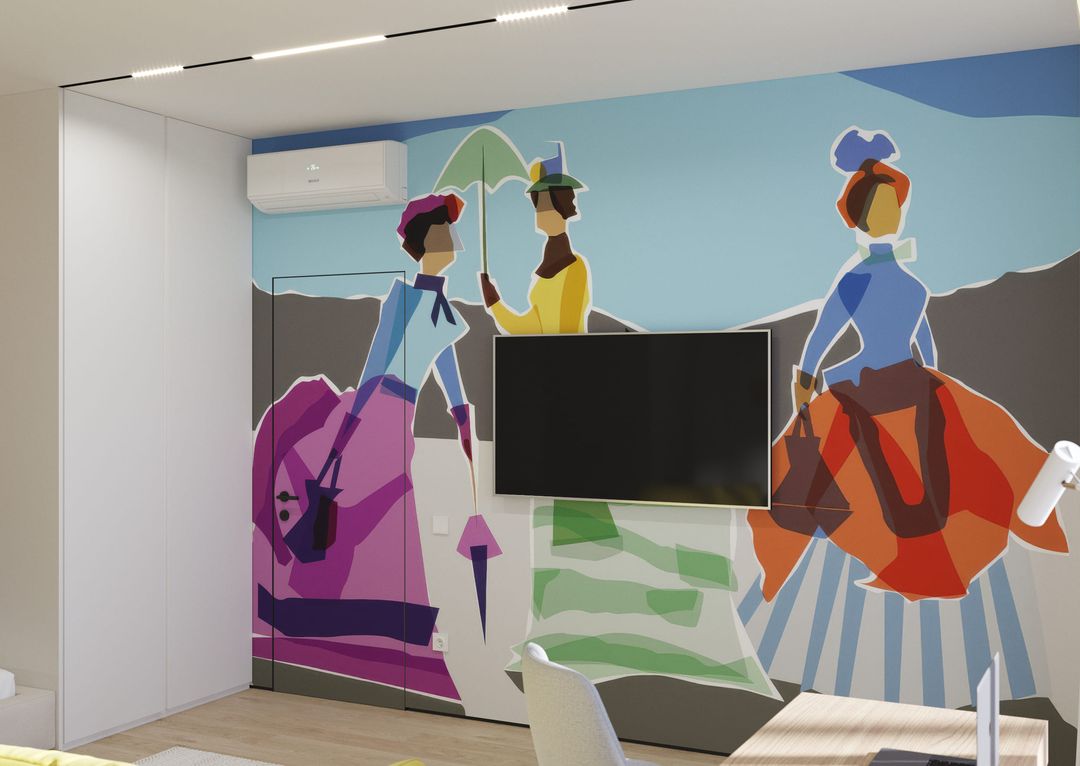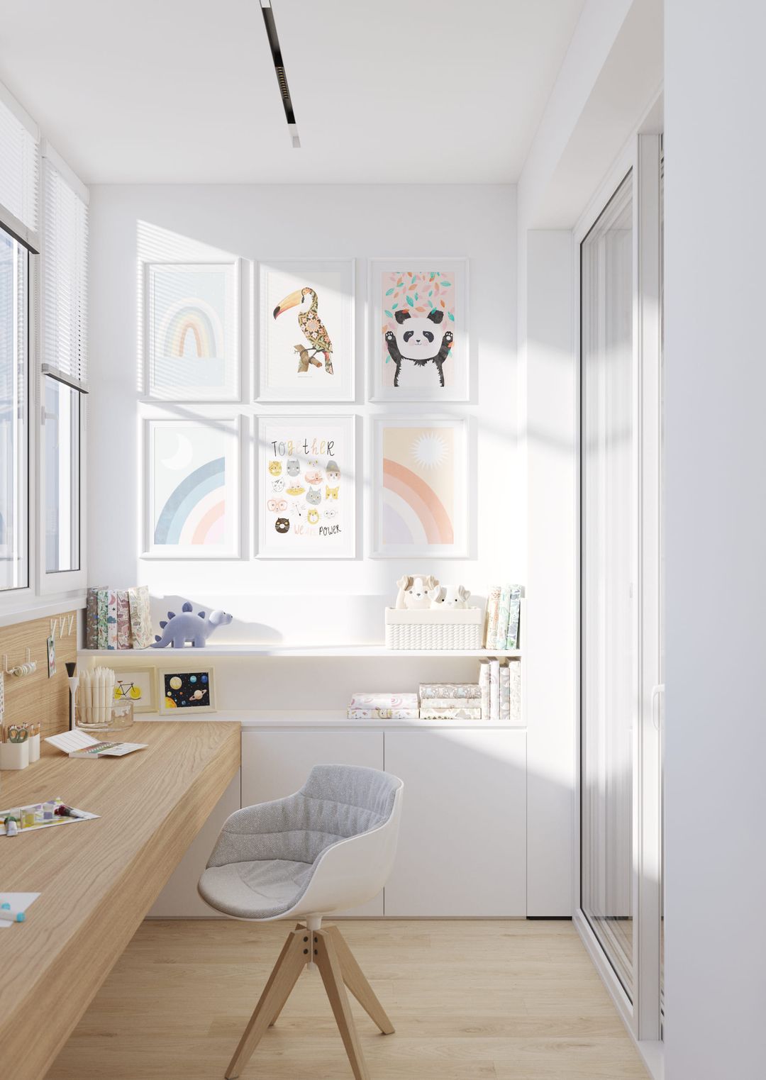 На балконе разместилась творческая мастерская дочери, которая рисует и занимается танцами. Для украшения стены с телевизором мы выбрали панно Wall&Deco, которое не только украсило стену, но и собрало в себе цветовую гамму помещения. Выход на балкон осуществляется через раздвижной витраж, который прекрасно защитит от холода зимой, но позволит оставить его открытым в летнее время, объединив, таким образом, два помещения.