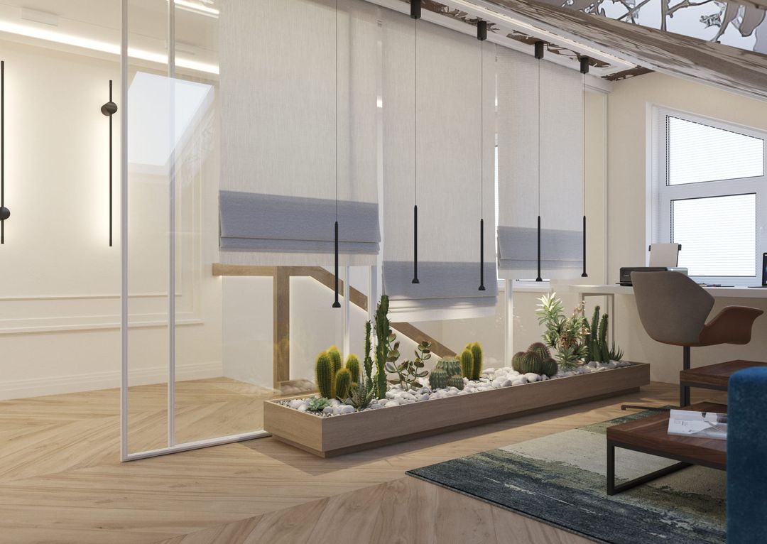 Это увеличило кабинет визуально, сделало оба пространства намного светлее и современнее. В основании витража мы разместили растения,а вдоль витража римские шторы и декоративные светильники для вечерней подсветки растений.