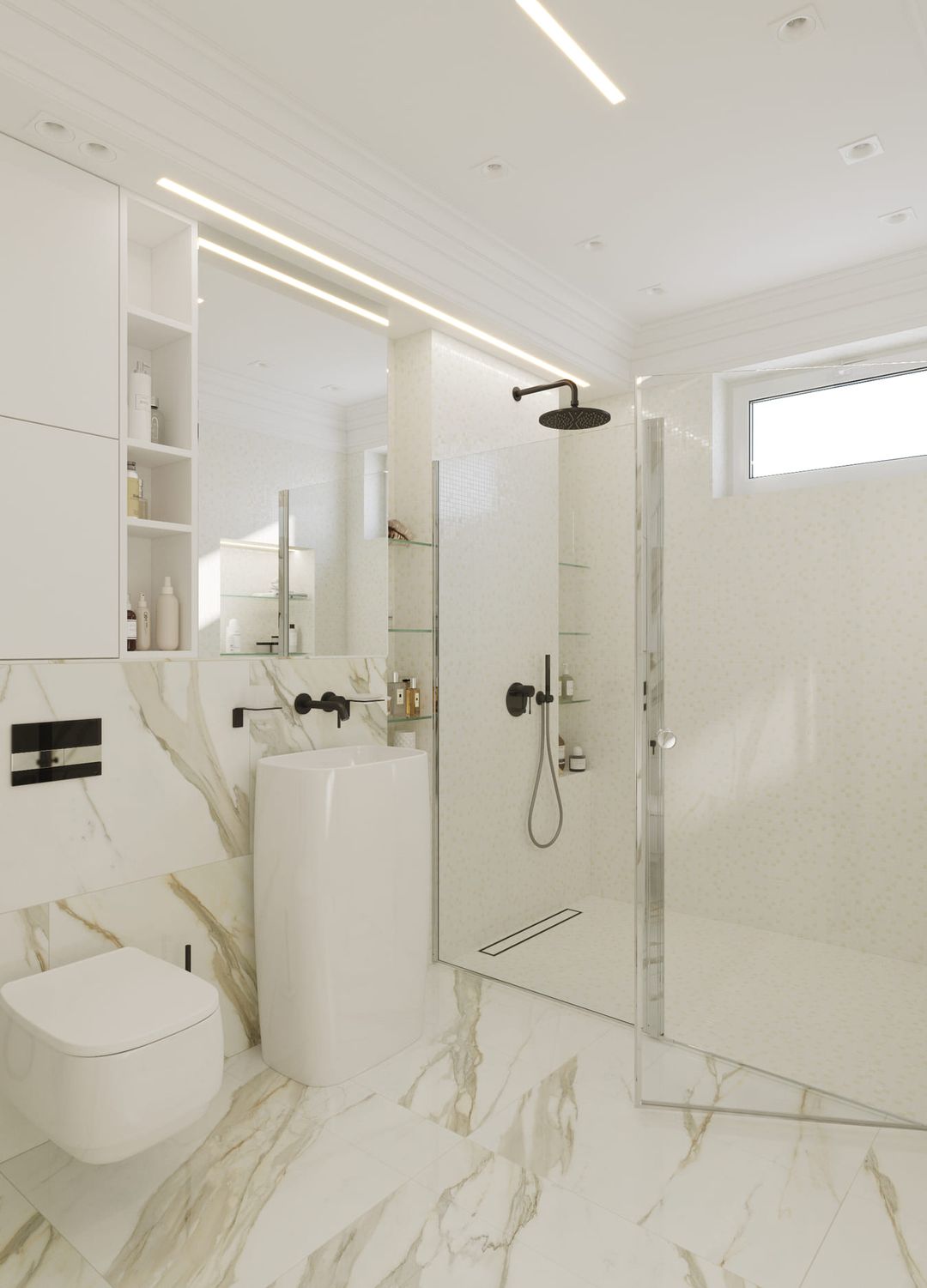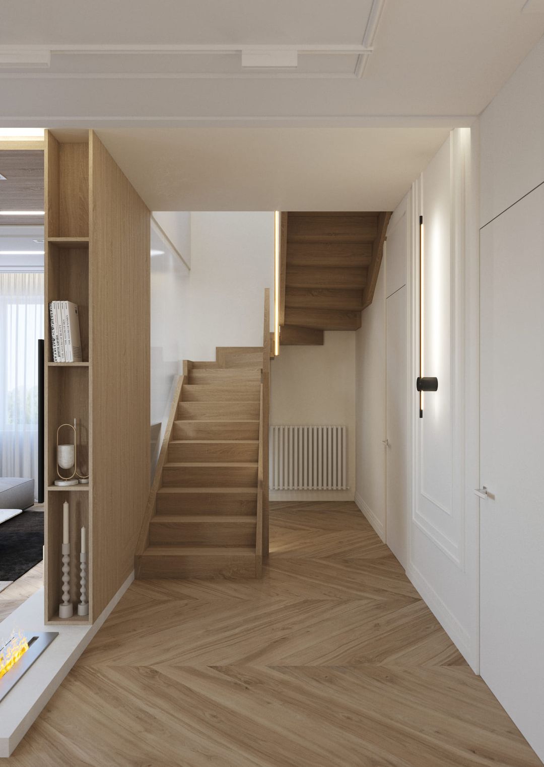 Пропорции гостиной подсказали решение тв-зоны и лестницы. Мы не стали закрывать лестницу полностью, отделив её от гостиной матовым стеклом. Таким образом визуально улучшились пропорции помещения, а из окна лестничного холла свет теперь проникает в гостиную.