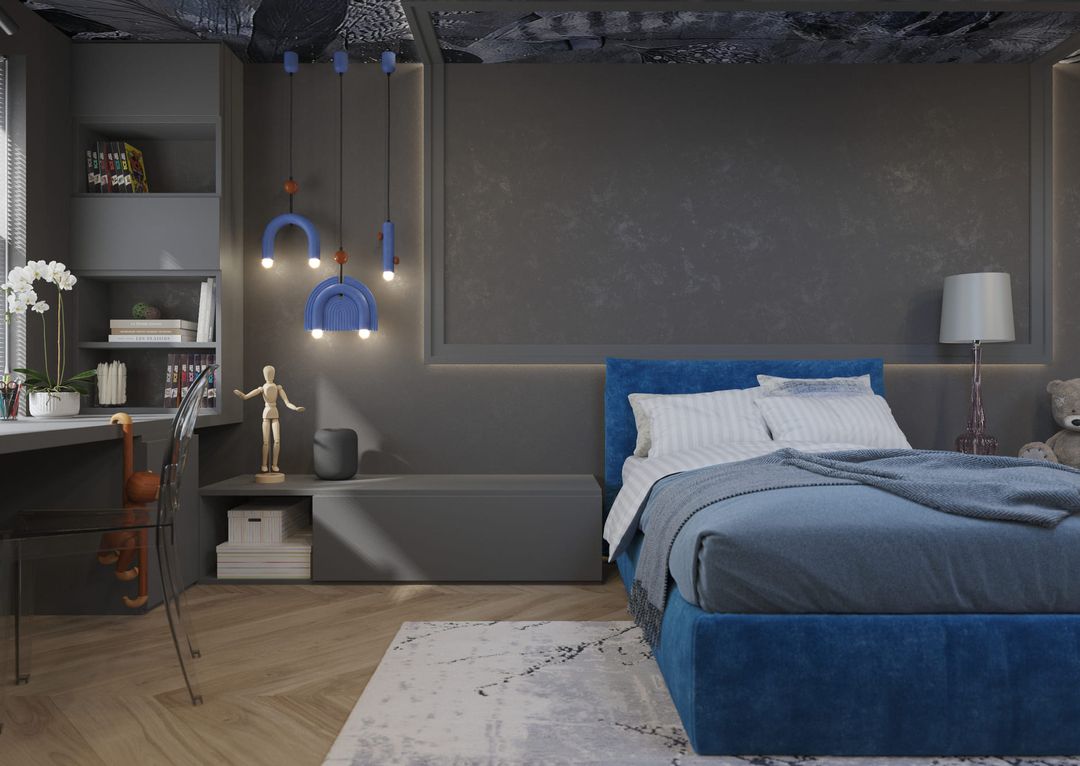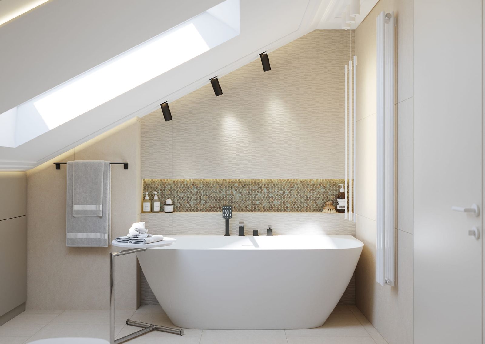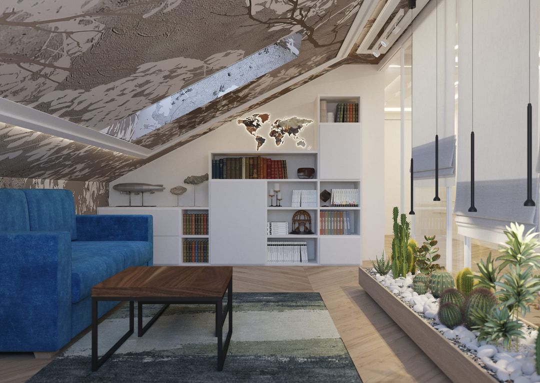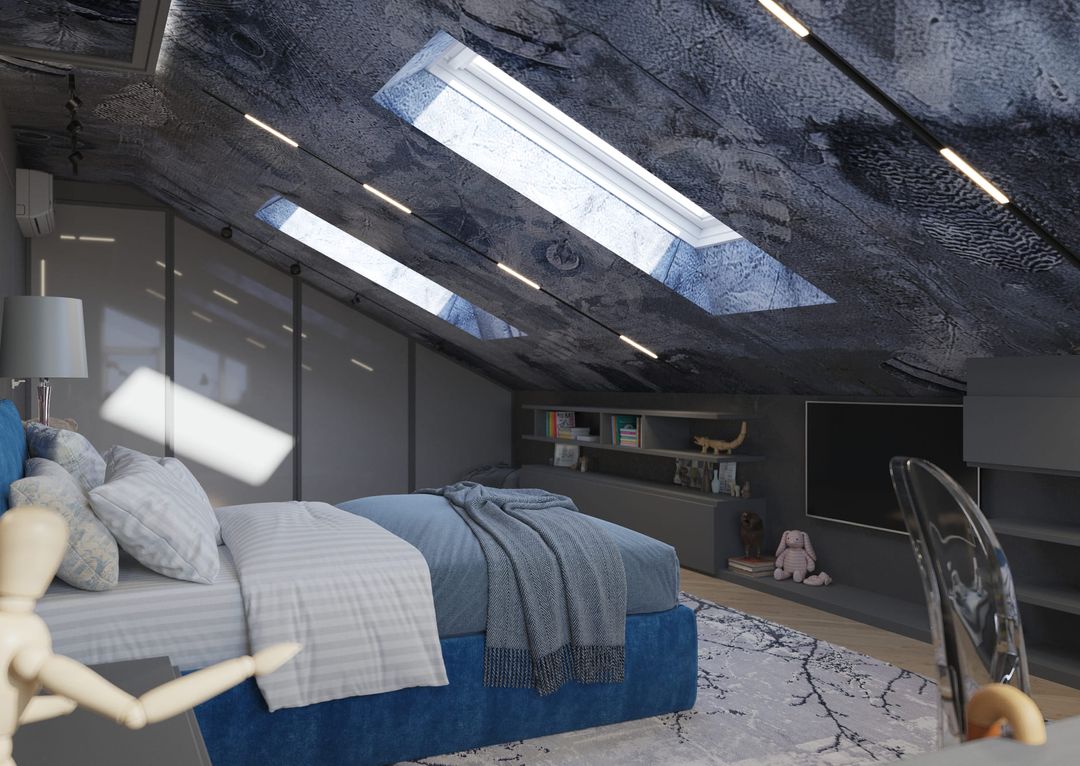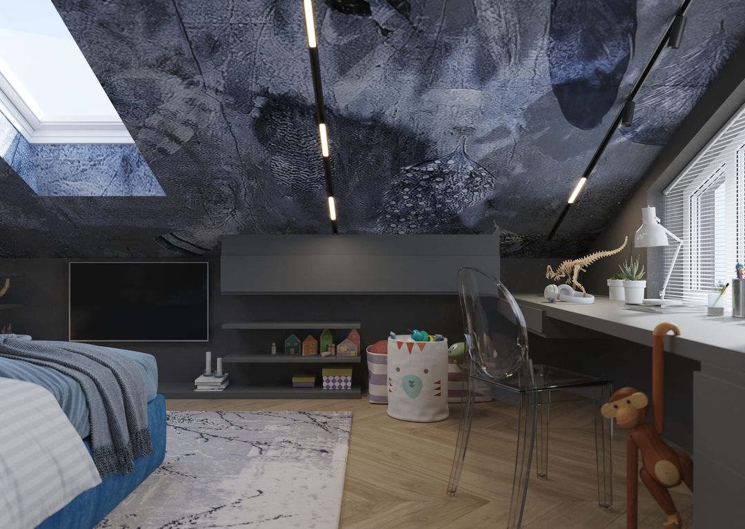 В детской весь скат кровли отделан фреской с растительным рисунком, который тем не менее вызывает ассоциации с морем или ночным летним небом. Слева при входе вместительный шкаф на всю стену, у окна –зона учебы с открытыми полками и местами хранения. Ванная комната с естественным светом (мы добавили мансардное окно. Места хранения под скатом кровли, отдельно стоящая ванна и широкая столешница с большим круглым зеркалом с подсветкой на круглой металлизированной мозаике.