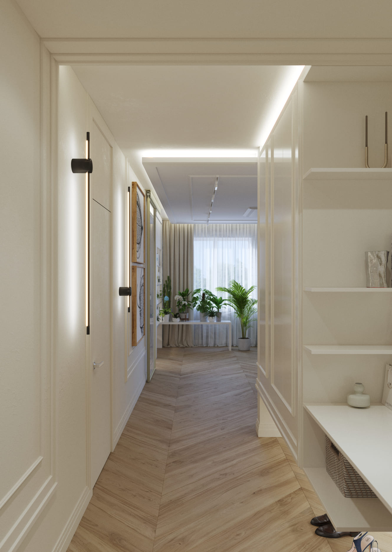 Кухня отделена от гостиной несущей стеной, потому объединять их мы не стали. Зато создали рядом с входом второй проем, в котором разместили полки с цветами и декором. Таким образом, кухня и гостиная стали более связаны визуально, а из гостиной стало видно сад. Кухня решена двумя параллельными линиями: пеналы с бытовой техникой и большой остров. Вытяжка встроена в столешницу, что тоже даёт больше пространства.