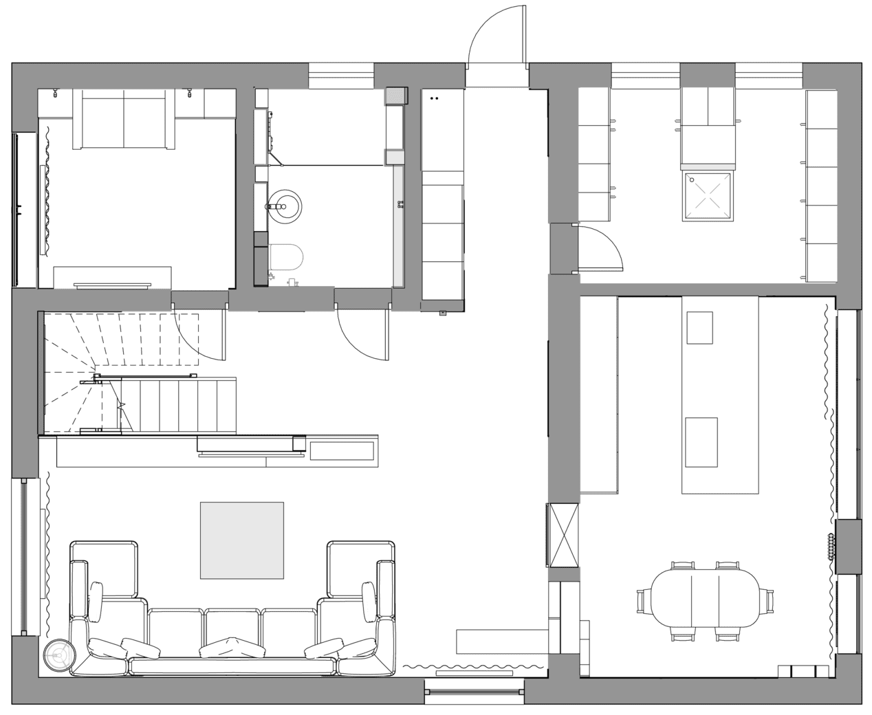 Дом двухэтажный. На первом этаже расположена кухня,гостиная, котельная, санузел и гостевая комната. Когда на обмерах мы увидели,что окно кухни выходит в сад, то сразу решили, что нужно сделать из него витраж в пол, чтобы дать в кухню больше света и открыть вид на участок.