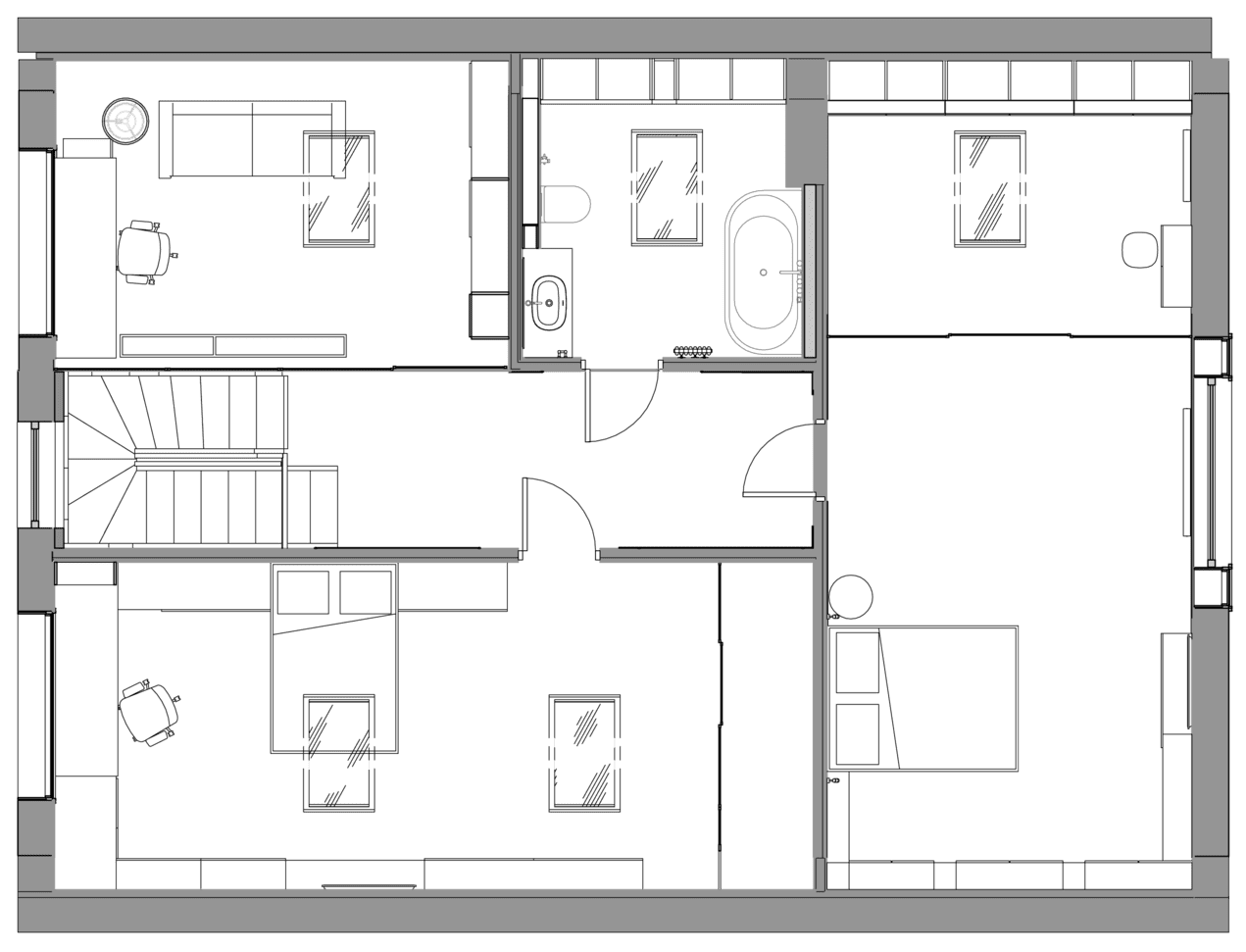 На втором этаже расположен спальня, детская, ванная и кабинет. С кабинетом связана интересная история. Изначально по проекту он был отделен от лестницы стеной. Мы приехали на объект в момент возведения перегородок и, поднявшись по лестнице, поняли, что нужно сделать между кабинетом и лестницей стеклянную перегородку.