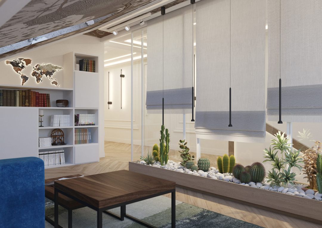 Это увеличило кабинет визуально, сделало оба пространства намного светлее и современнее. В основании витража мы разместили растения,а вдоль витража римские шторы и декоративные светильники для вечерней подсветки растений.