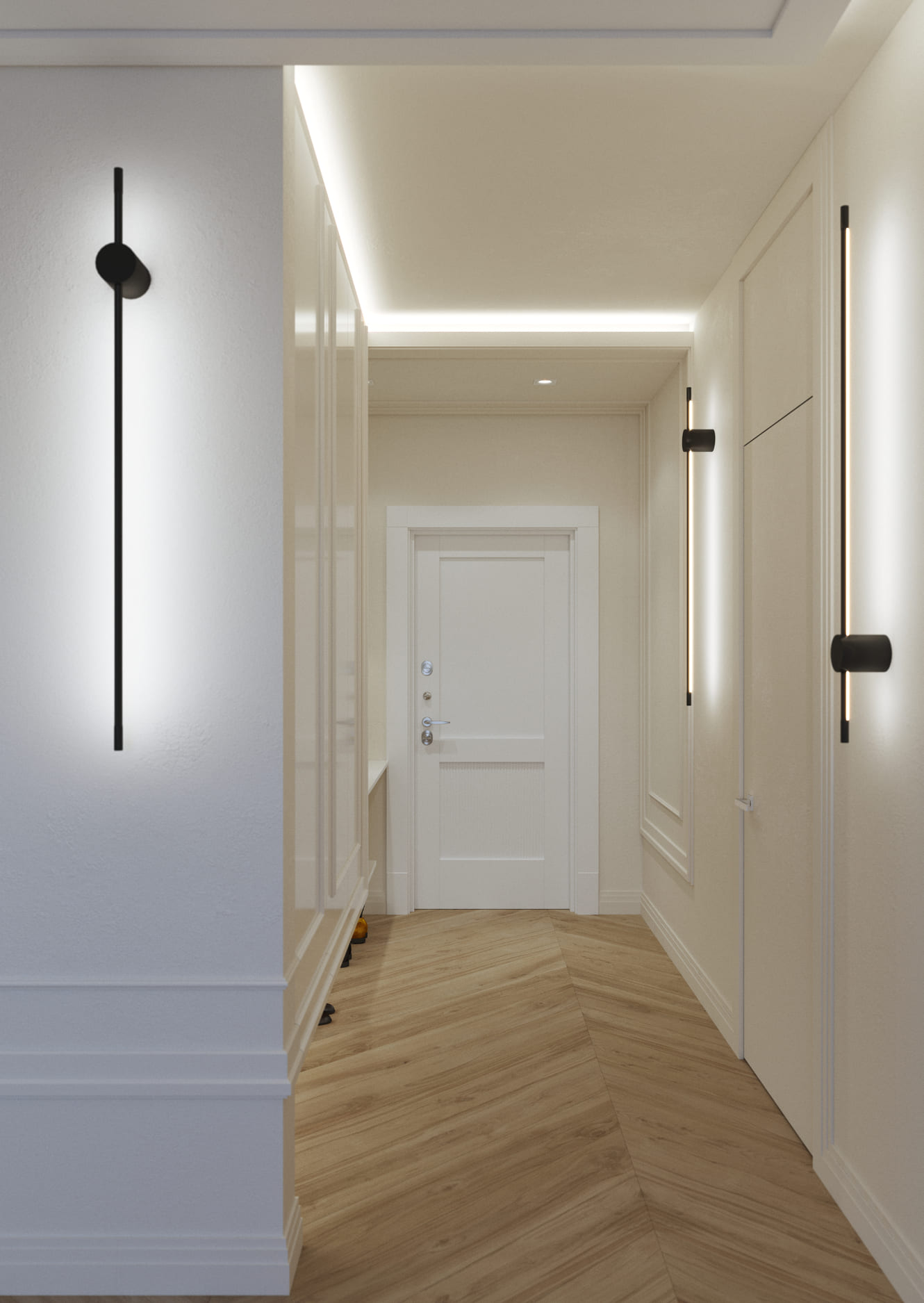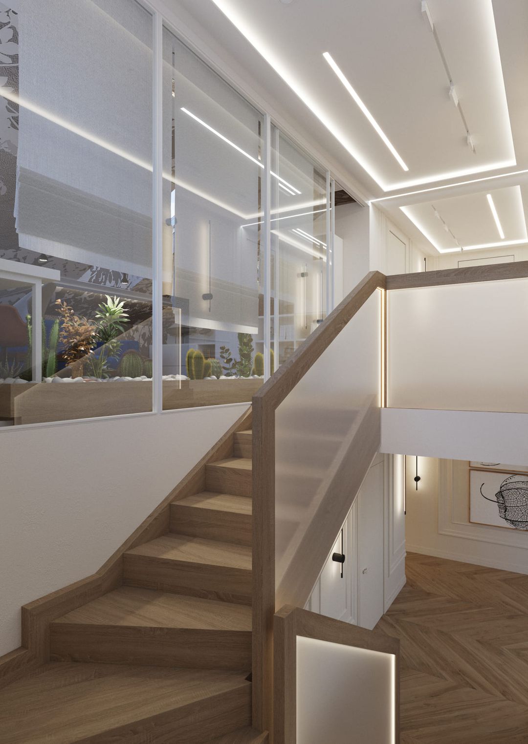 Пропорции гостиной подсказали решение тв-зоны и лестницы. Мы не стали закрывать лестницу полностью, отделив её от гостиной матовым стеклом. Таким образом визуально улучшились пропорции помещения, а из окна лестничного холла свет теперь проникает в гостиную.