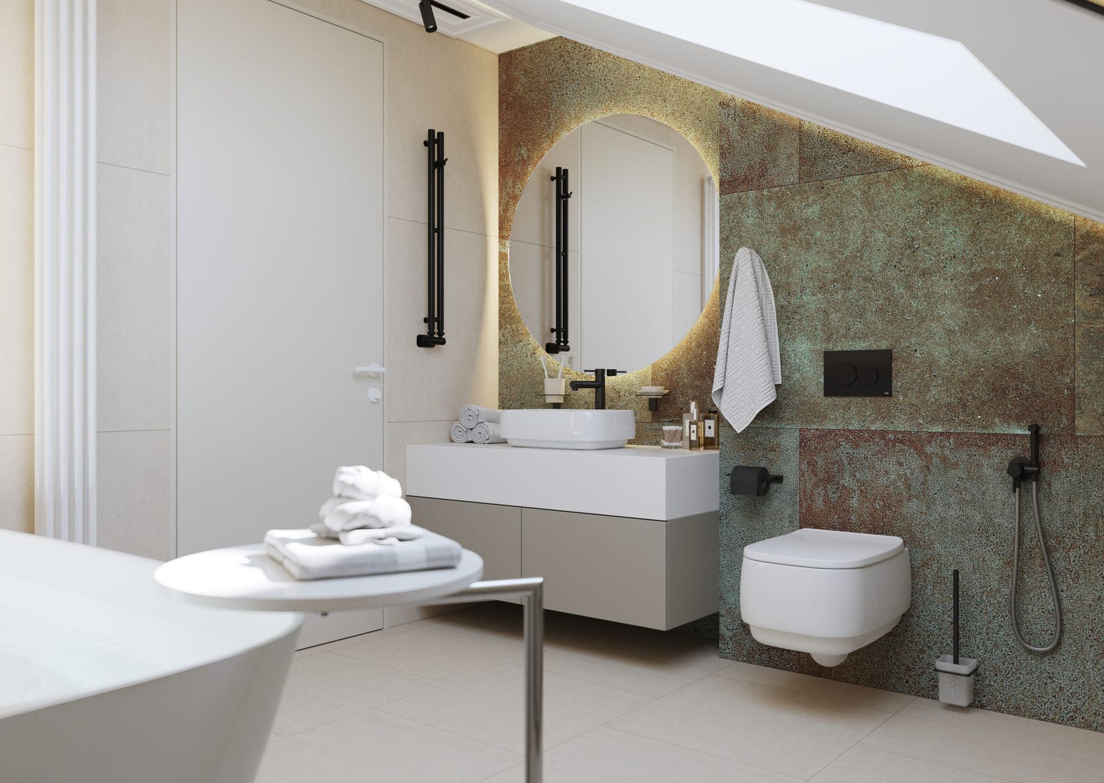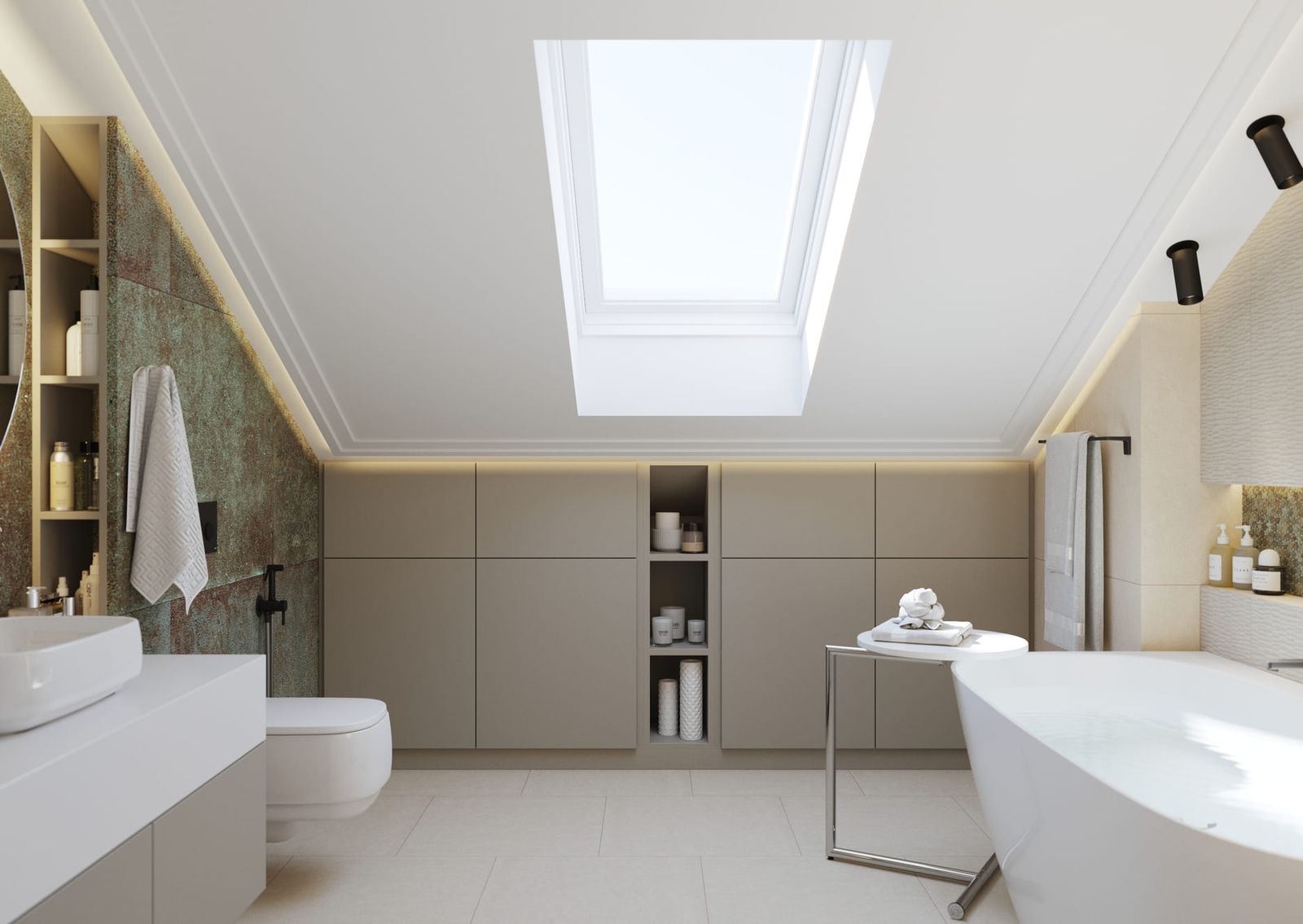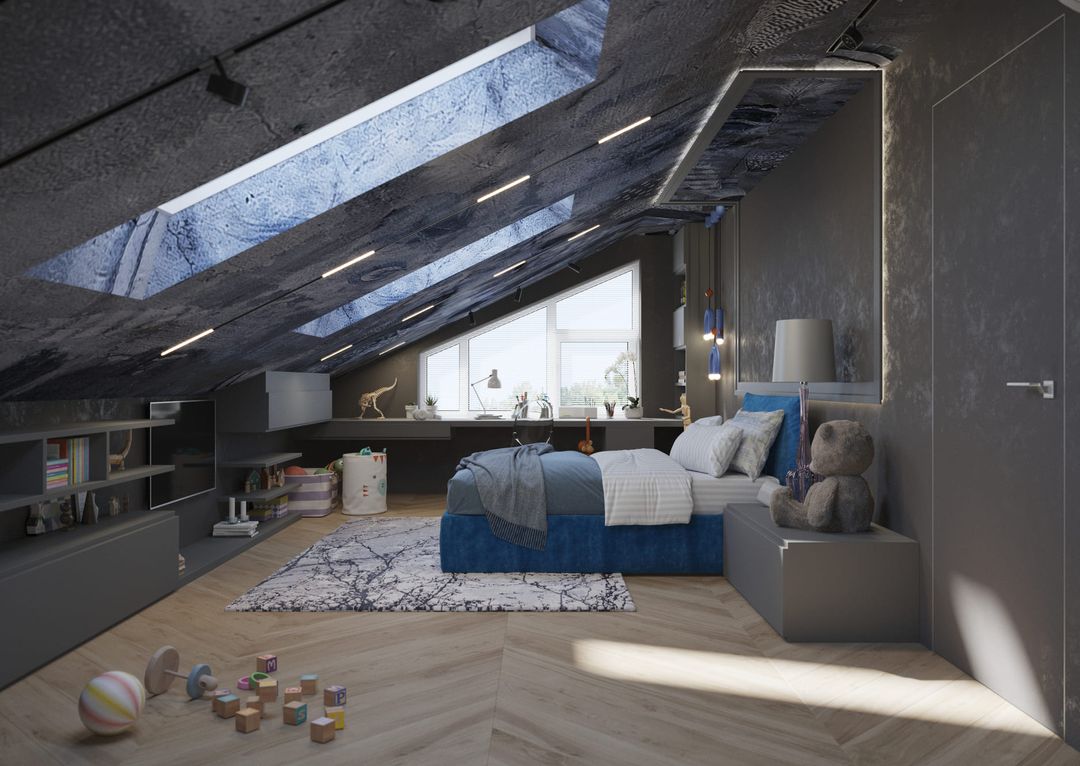 В детской весь скат кровли отделан фреской с растительным рисунком, который тем не менее вызывает ассоциации с морем или ночным летним небом. Слева при входе вместительный шкаф на всю стену, у окна –зона учебы с открытыми полками и местами хранения. Ванная комната с естественным светом (мы добавили мансардное окно. Места хранения под скатом кровли, отдельно стоящая ванна и широкая столешница с большим круглым зеркалом с подсветкой на круглой металлизированной мозаике.