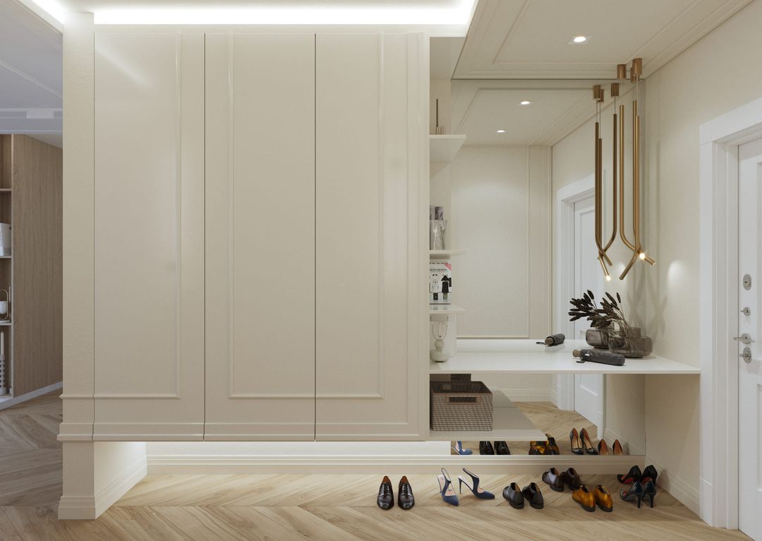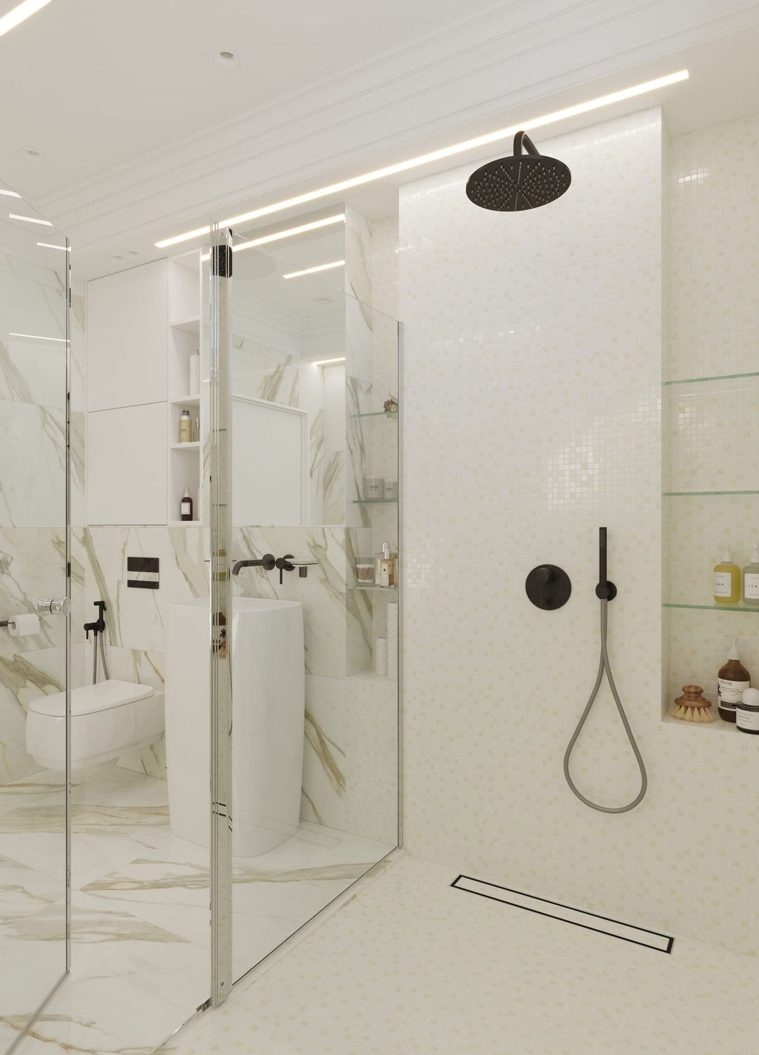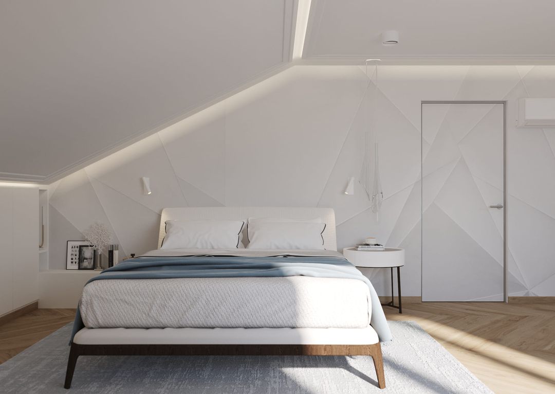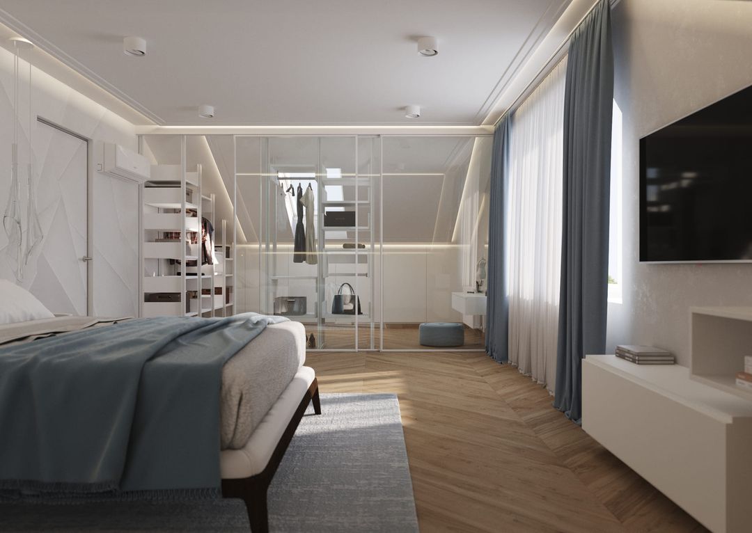 Спальня родителей – это просторное светлое помещение с гардеробной, которую мы отделили раздвижной стеклянной перегородкой. Справа от кровати места хранения с открытыми нишами, напротив кровати телевизор.