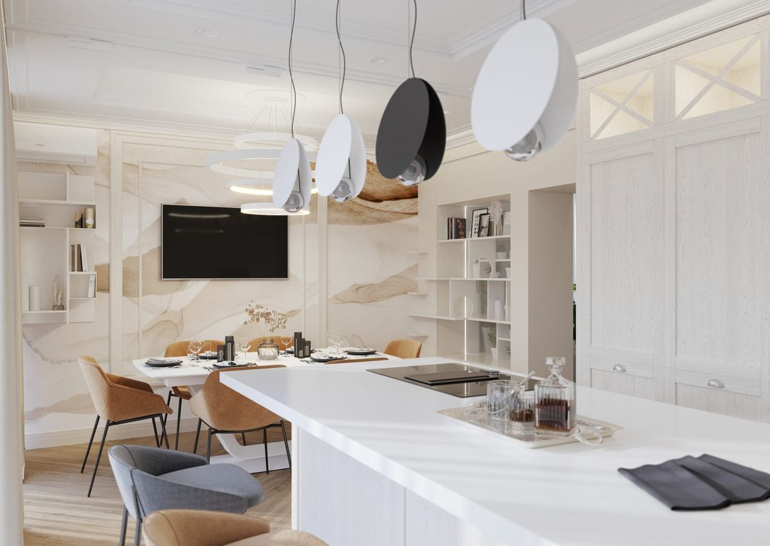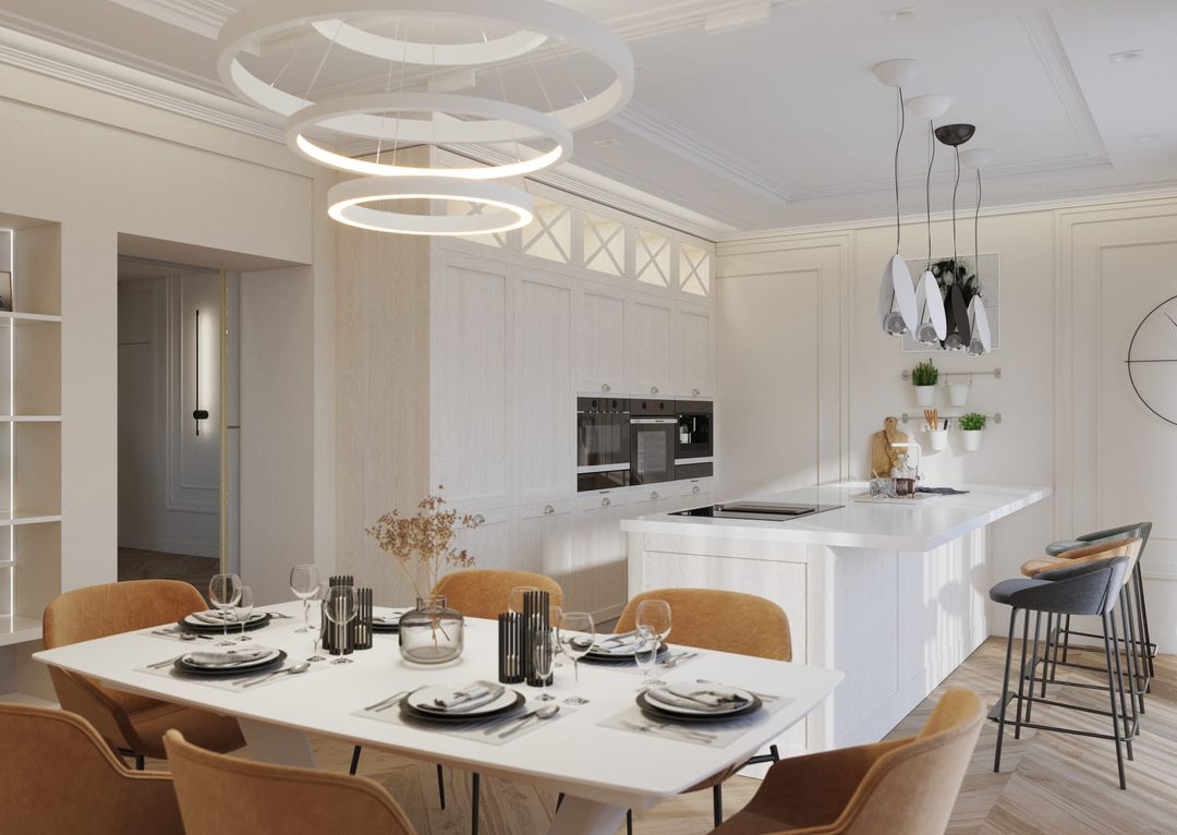 Кухня отделена от гостиной несущей стеной, потому объединять их мы не стали. Зато создали рядом с входом второй проем, в котором разместили полки с цветами и декором. Таким образом, кухня и гостиная стали более связаны визуально, а из гостиной стало видно сад. Кухня решена двумя параллельными линиями: пеналы с бытовой техникой и большой остров. Вытяжка встроена в столешницу, что тоже даёт больше пространства.