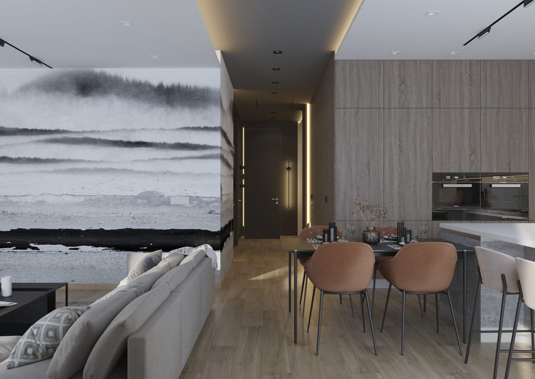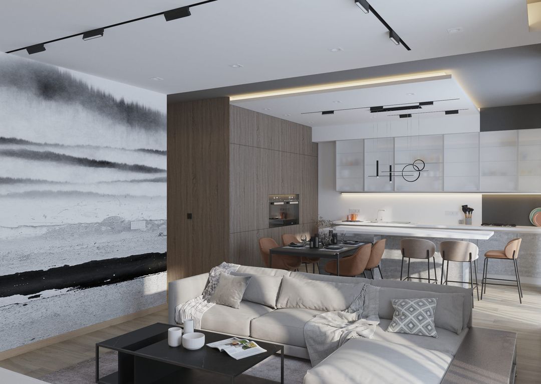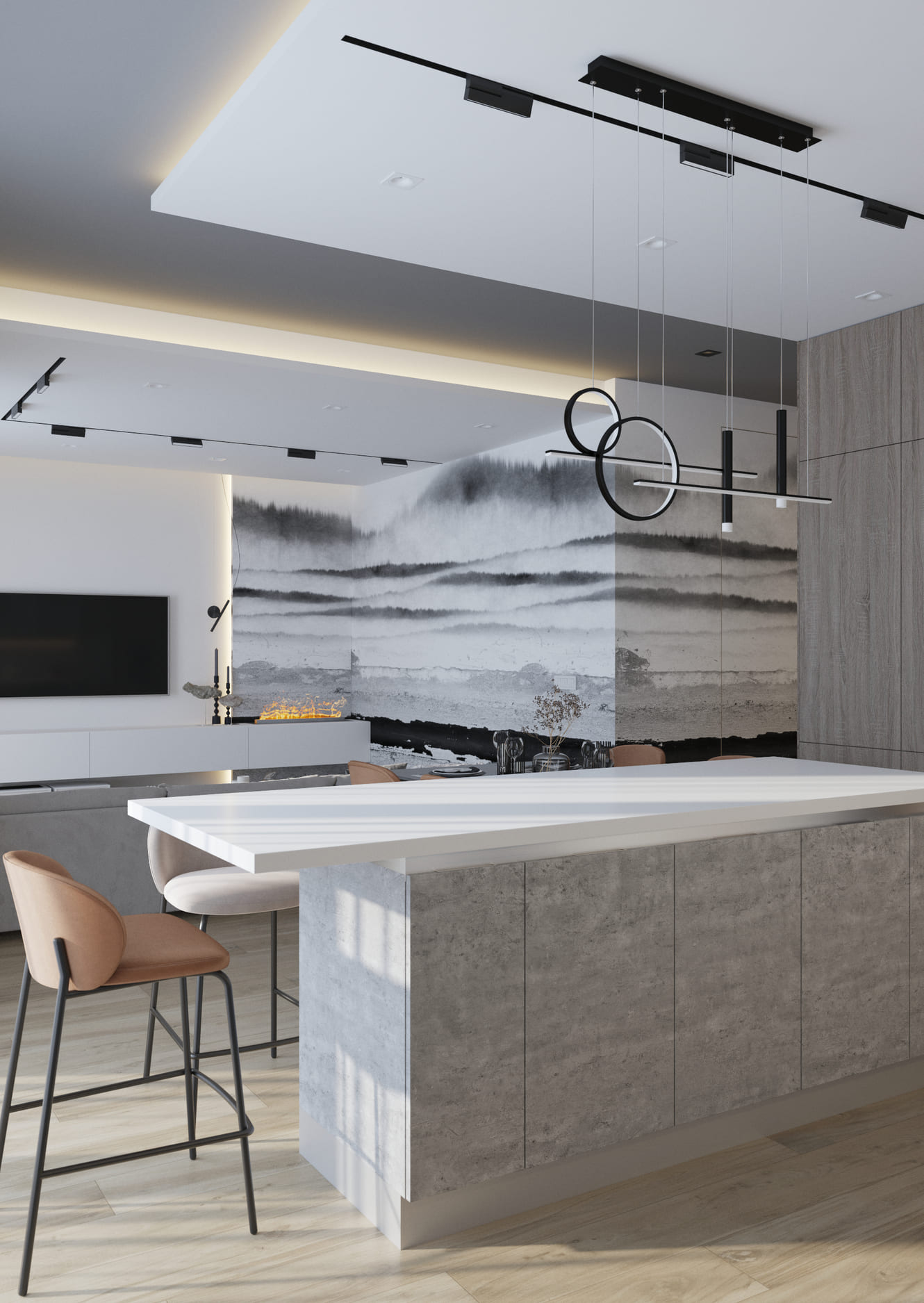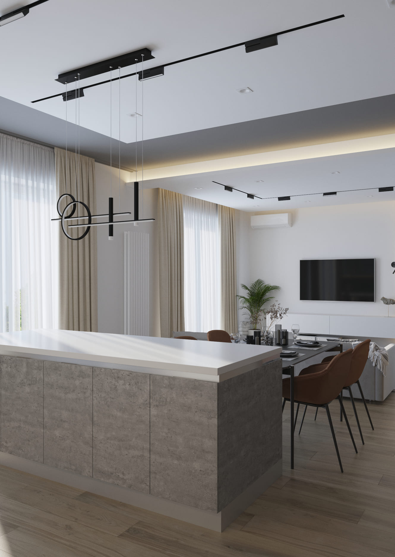 Кухня-гостиная состоит из двух зон: кухни с островом и столом и гостиной. На кухне реализована не совсем обычная компоновка кухни. Столешница и навесные шкафы не доходят до пеналов. Это, с одной стороны, облегчает кухню визуально, с другой, дает доступ к угловому шкафу.