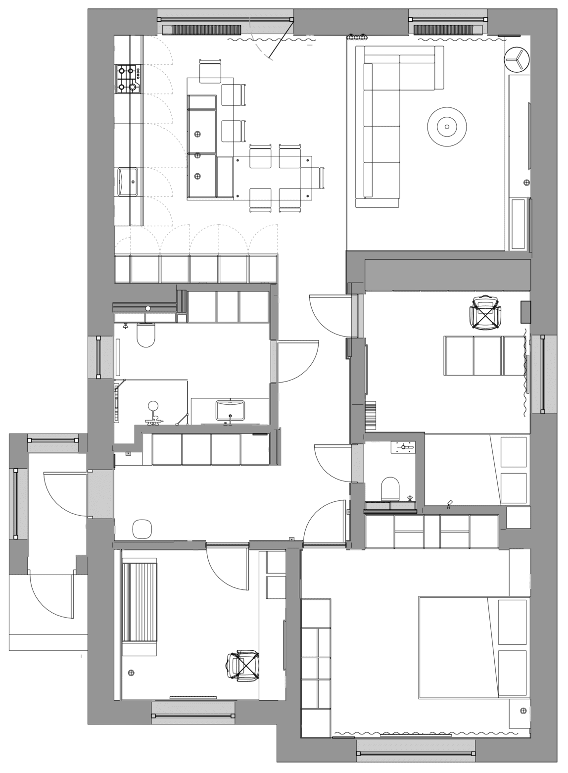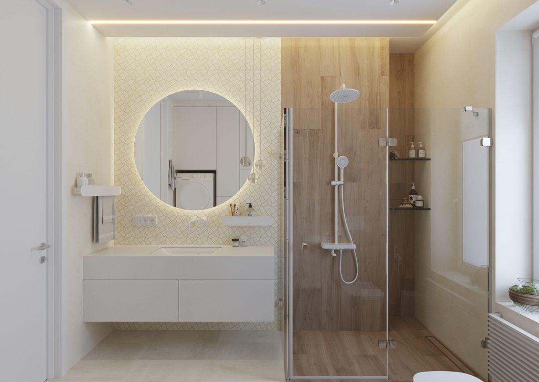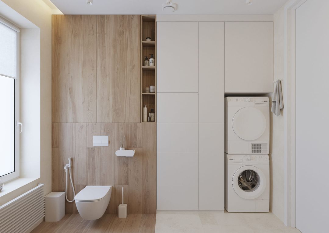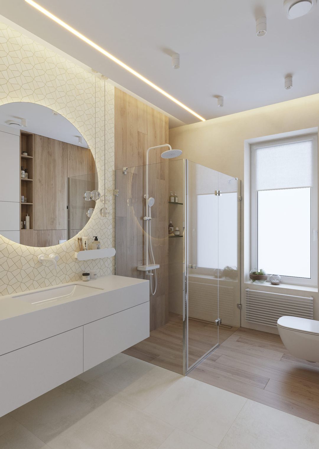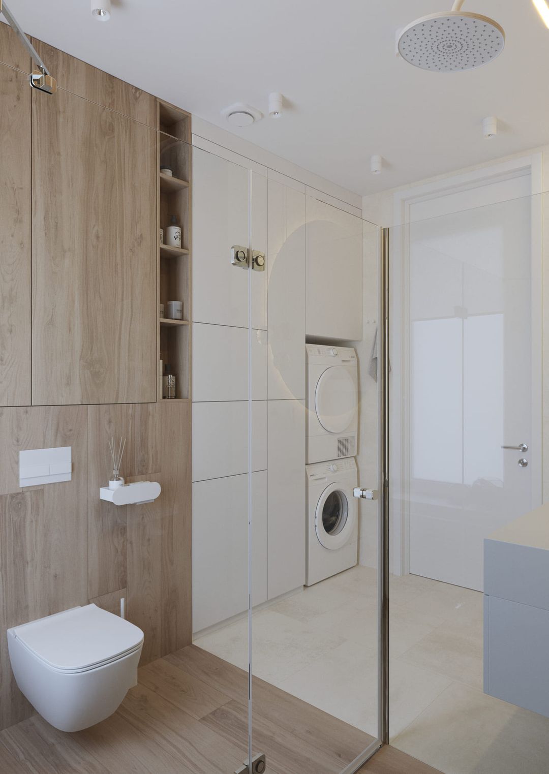 Рабочее пространство на столешнице было достаточным, но мы дополнили кухонную мебель островом и столом для больших компаний. Таким образом, утром можно перекусить за островом, а стол сервировать при необходимости. Ванная комната просторная и светлая: мы увеличили высоту окна,сделав ниже подоконник. Помимо душевой зоны, унитаза и раковины тут созданы вместительные места хранения разной глубины и ниша для стиральной и сушильной машин.