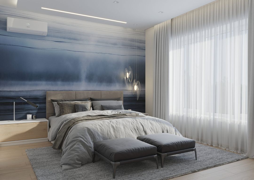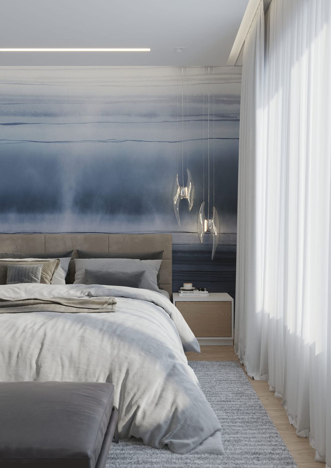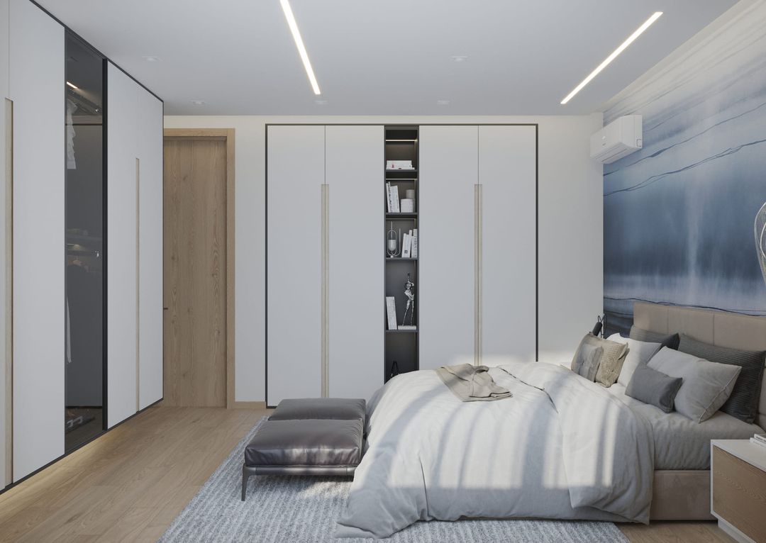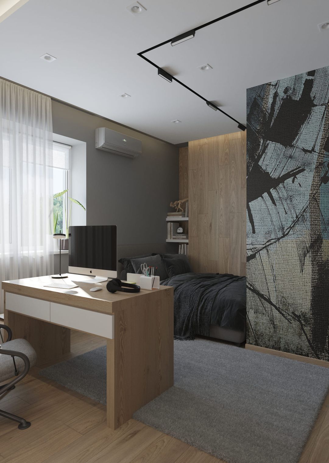 В изголовье кровати в спальне родителей фреска, а напротив, у двери, зеркало от пола до потолка. В детской роль зеркала выполняет фасад шкафа с зеркальной поверхностью. Кровать размещена в уютной нише, у окна стол для учебы. За ним открытые и закрытые ниши для книг и всего необходимого