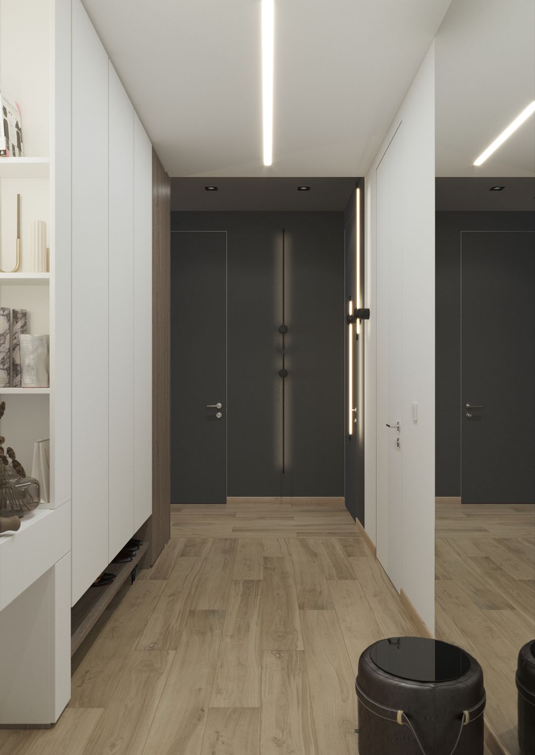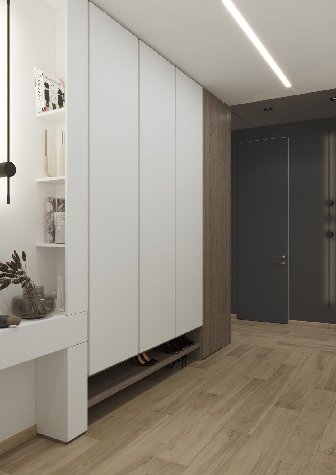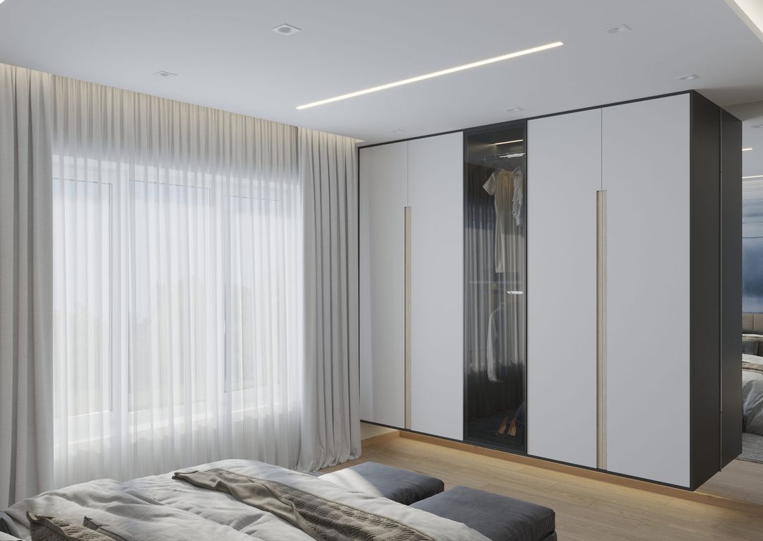 Пропорции и габариты дома в сочетании с требованиями ТЗ не оставляли пространства для отдельных гардеробных, потому в спальне нам пришлось спроектировать два больших шкафа для вещей родителей, а в детской сделать встроенный шкаф на всю стену слева от входа.