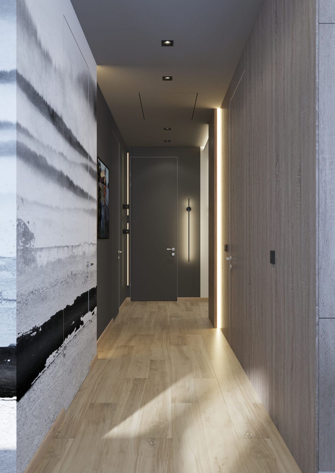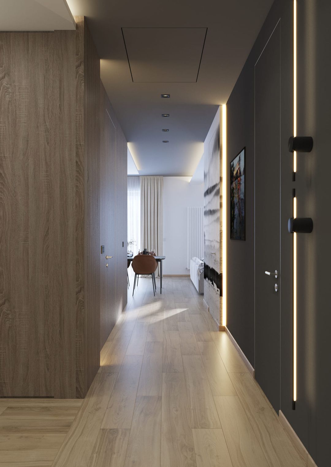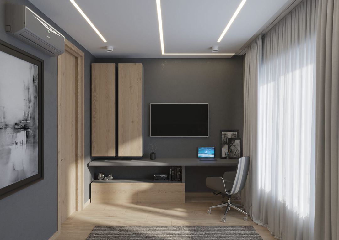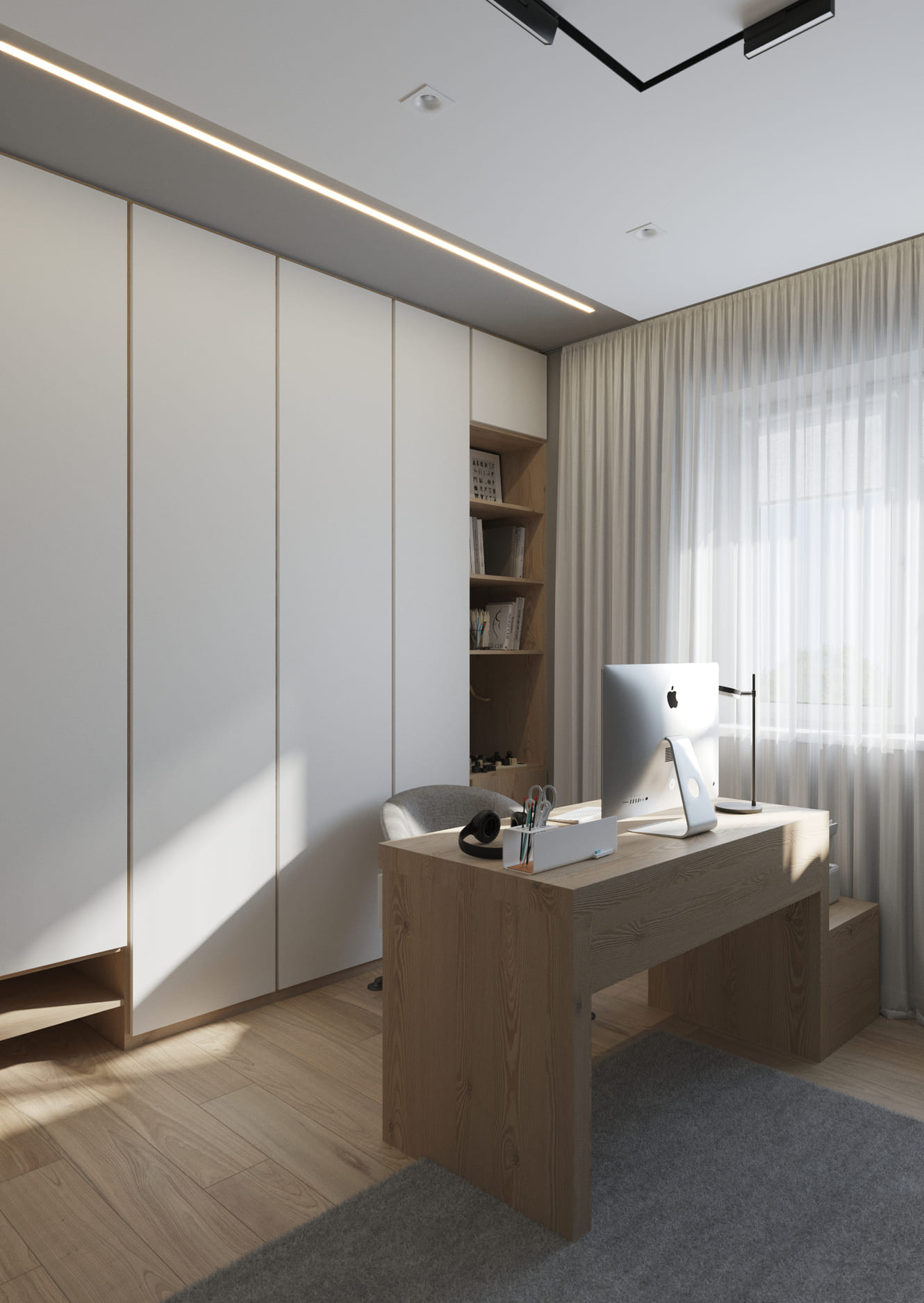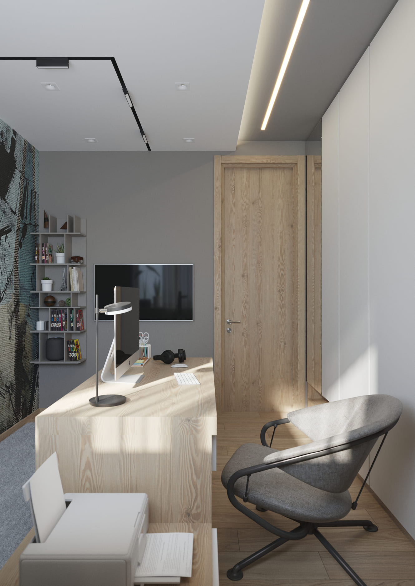 В кабинете помимо рабочего места предусмотрен и раскладной диван, и небольшие шкафы на случай гостей. Высота потолков в доме не очень велика, потому двери сделаны почти без перемычки. Такой прием зрительно увеличивает высоту помещения, улучшая его пропорции. Как и в других помещениях, в кабинете мы предусмотрели несколько сценариев освещения: подсветка ниши над диваном — часть вечернего сценария.