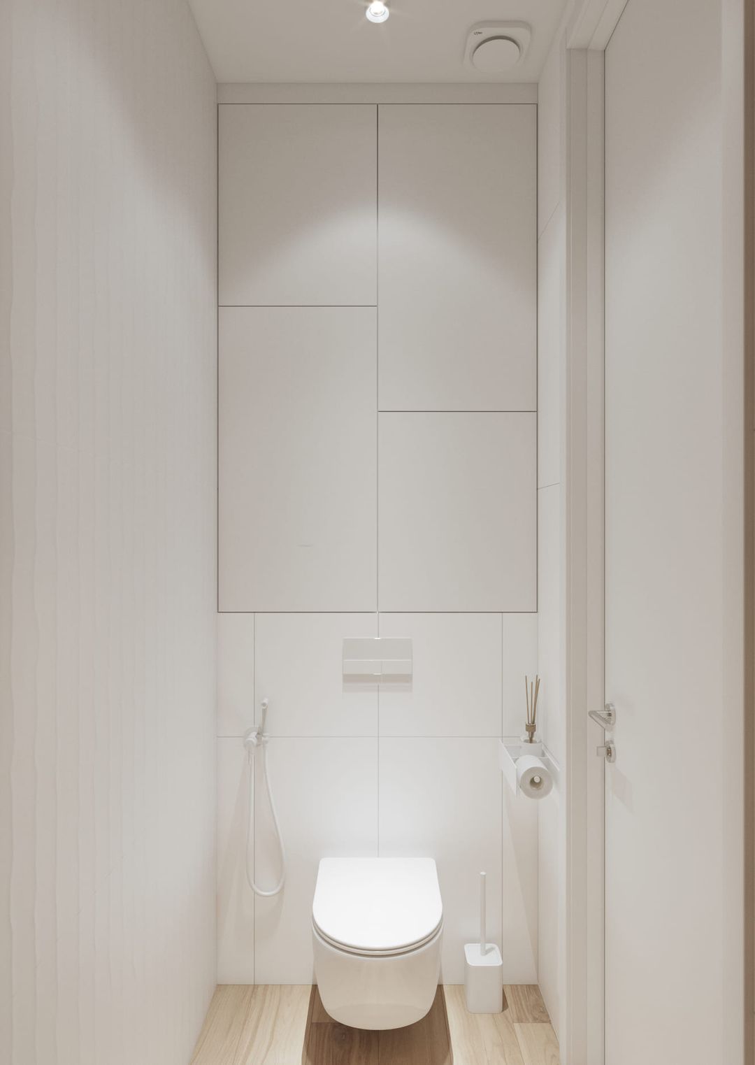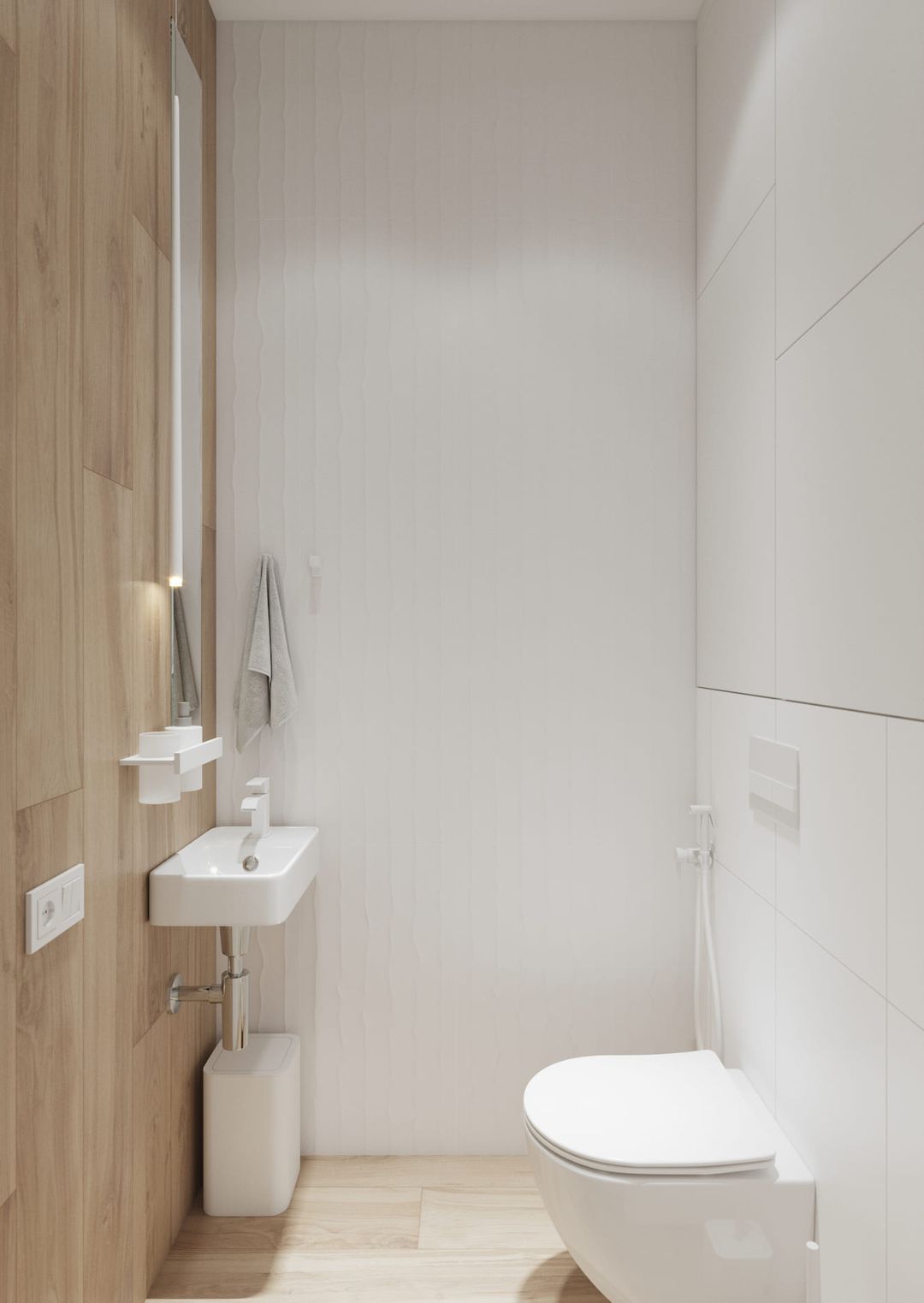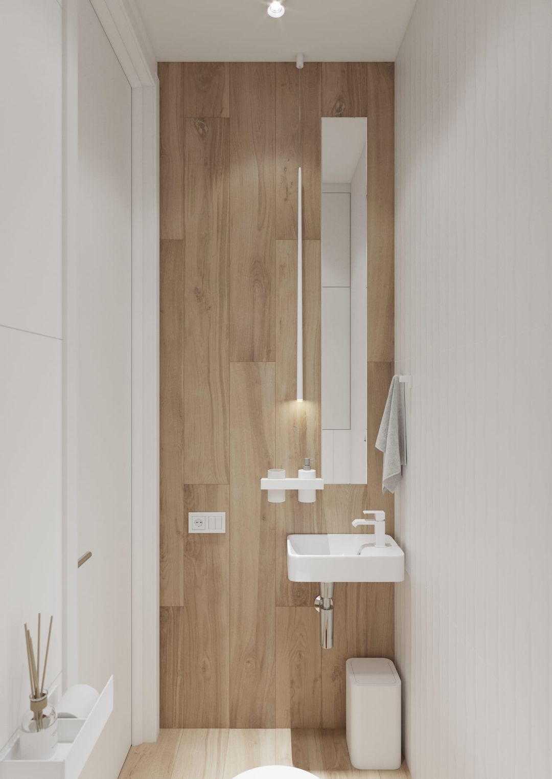 Гостевой санузел – самое маленькое помещение в доме. При проектировании мы боролись за каждый сантиметр, чтобы для него хватило места. Для отделки использовано три вида плитки: керамогранит с текстурой дерева, объемный декор и фоновая матовая белая плитка. Сочетание белых аксессуаров и текстуры дерева покорило всех участников проекта.